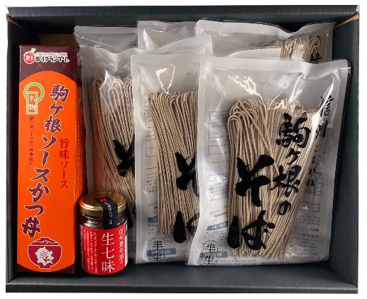 名称そば、薬味みそ、たれ(ソースかつ丼用)内容量■信州駒ヶ根産「生そば」 そば:100g×3袋×2包 つゆ:25g×3袋×2包 合計750g ■生七味(55g) ■ソースかつ丼旨味ソース(350g)原材料そば: めん〔そば粉(長野県駒ケ根産)、小麦粉、麦芽糖、食塩、小麦たんぱく〕、めんつゆ〔砂糖・果糖ぶどう糖液糖、しょうゆ(小麦・大豆を含む)、食塩、かつおエキス(さば・鶏肉・大・・・