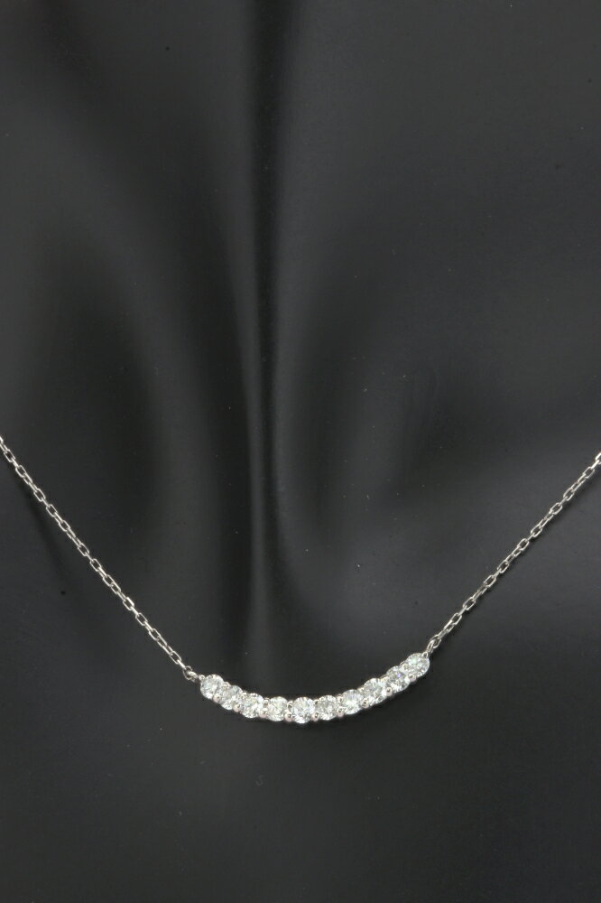 すっきりとしたラインが柔らかな印象にし、デコルテを綺麗に演出します。 返礼品詳細 品名 Pt900曲線ラインダイヤモンド0.50ctネックレス 寸法 ○トップ 縦:約6.65mm 横:約23.0mm 厚:約2.0mm ○チェーン 長さ:0.24φ角小豆45cm(スライドアジャスター) 重量 ○トップ 約2.15g 素材 ○トップ Pt900・ダイヤモンド0.50ct(10pcs・・・