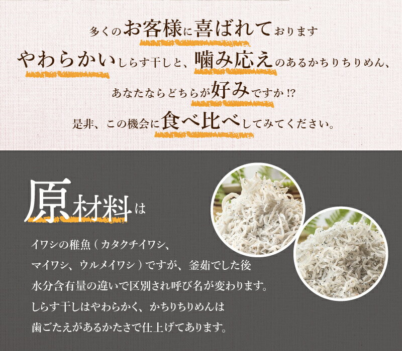 商品説明 商品名 【ふるさと納税】絶品!三河しらすとかちりちりめん食べ比べ2種セット H018-004 内容量 しらす干し400g化粧箱入×1、かちりちりめん400g化粧箱入×1 「しらす干し」も「かちりちりめん」も食べ方は同じです。お好みに合わせてご賞味ください。 ※魚の大きさや色の良し悪しは自然の物ですので常に一定ではありません。 獲れる時期や漁場によって異なる場合がありますのでご了承ください。 商品説明 しらす干しとかちりちりめんの原材料はイワシの稚魚(カタクチイワシ、 マイワシ、ウルメイワシ)ですが、釜茹でした後 水分含有量の違いで区別され呼び名が変わります。 しらす干しはやわらかく、かちりちりめんは歯ごたえがあるかたさで仕上げてあります。 賞味期限 しらす干し…冷凍1ヶ月、冷蔵6日(解凍日含む) かちりちりめん…冷凍2ヶ月、冷蔵12日(解凍日含む) 提供元事業所から皆様へ 新型コロナウイルス感染症拡大による、直売所への来客の減少、学校休校による給食用の出荷の停滞、飲食店営業自粛による市場の流通低下し、小売り、市場、行政とすべての販売先が減少し、かなり深刻的な影響を受けました。寄附をいただくことで滞留している在庫も流通させることができるので生産者支援にもつながります。碧南市で水揚げされた三河しらすをぜひお召し上がりください! 保存方法 しらす干し…要冷凍(-18