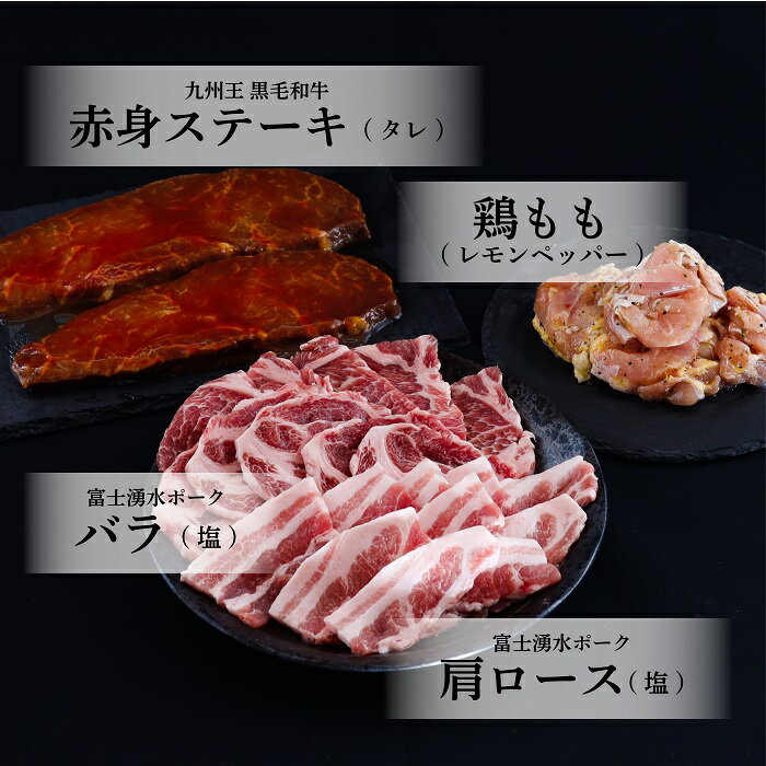 ・ふるさと納税よくある質問はこちら ・寄付申込みのキャンセル、返礼品の変更・返品はできません。あらかじめご了承ください。 ・ご要望を備考に記載頂いてもこちらでは対応いたしかねますので、何卒ご了承くださいませ。 ・寄付回数の制限は設けておりません。寄付をいただく度にお届けいたします。 品名 富士湧水ポーク入 バーベキューセット※着日指定不可※ 商品概要 富士山麓の澄んだ空気と清らかな地下水。豚の飼育にとって理想的な環境の中で、富士湧水ポークは育てられています。徹底された厳しい豚種管理のもと、デュロック系と大ヨーク系を配合。またイースト菌を使用した食品をいち早く導入するなど、研究を重ね、常に最高の条件と時間をかけて作り上げました。甘みのある脂質、肉のしまり、柔らかい肉質そして旨味とコクはまさに絶品です。 今回は富士湧水ポークの切り落としと黒毛和牛(九州王)のセットで提供させていただきます。 ■事業者情報 事業者名:MEATPRO鈴木 連絡先:0550-84-2911 営業時間:9:00〜19:00 定休日:火曜日 産地名/ 山梨県都留市 内容量/ サイズ(容量) 富士湧水ポーク バラ・肩ロース(塩ダレ)200g×1 300g×1 黒毛和牛 九州王 タレ漬け赤身ステーキ 120g×1 180g×1 鶏ももレモンペッパー 300g×1 賞味期限 (消費期限) 出荷日より7日間(冷蔵庫で保存