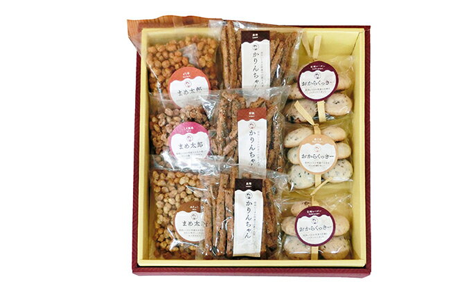 名称豆菓子、豆菓子、豆菓子、揚菓子、クッキー、揚菓子、クッキー内容量まめ太郎(100g)×3袋、かりんちゃん(90g)×3袋、おからくっきー(巨峰5枚)×2袋、おからくっきー(ごま6枚)×1袋原材料豆菓子: 大豆、砂糖、小麦粉、味噌(大豆。米こうじ、食塩)、サラダ油豆菓子: 大豆、砂糖、小麦粉、味噌(大豆、米こうじ、食塩)、サラダ油、一味唐辛子豆菓子: 大豆、砂糖、小麦粉。サラ・・・