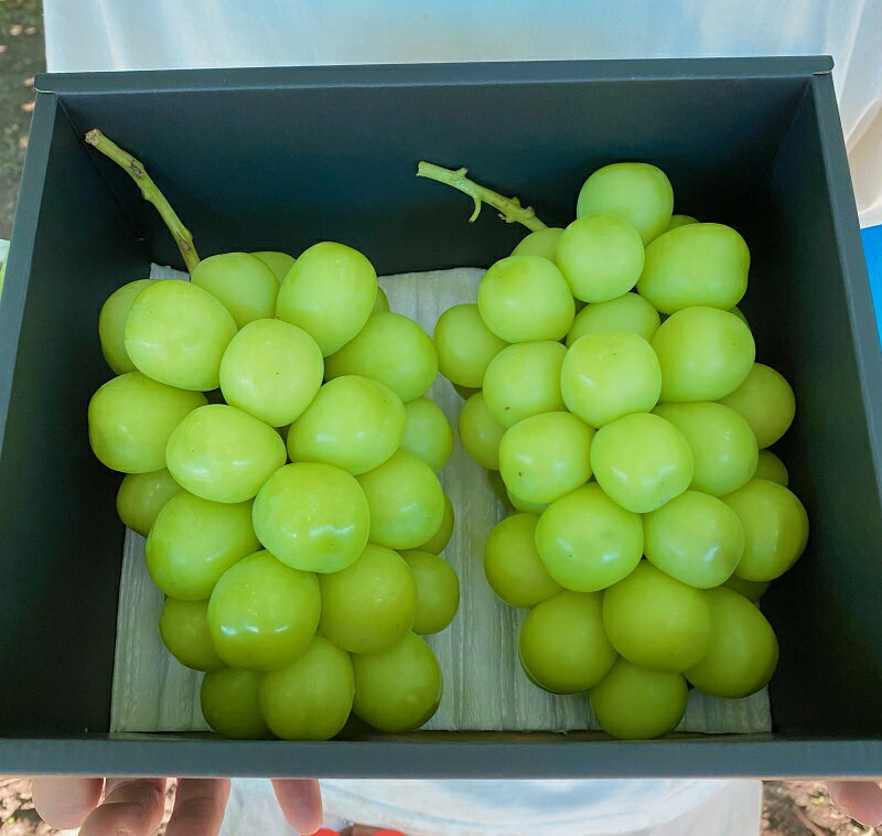 大粒のシャインマスカットを2房で発送します。ぶどう日本一の生産量を誇る笛吹市内で丹精込めて作られた大人気のシャインマスカットです。