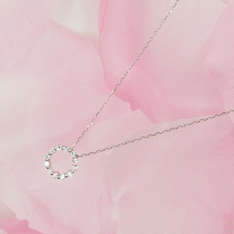 厳選された12石のダイヤモンドをトータル0.15ct使用したサークルモチーフのネックレス。 大胆なフォルムで胸元で輝きエレガントに着けれるアイテム。 山梨県甲府市で一貫して作成した商品。 『宝石の街 甲府』に立地します当社は、創業以来70年余りの永きに渡り宝飾品を一貫して製造販売しており、金やプラチナをはじめ、地金から職人が一工程ずつ確かな技術により裏打ちされた製品を仕上げてお・・・