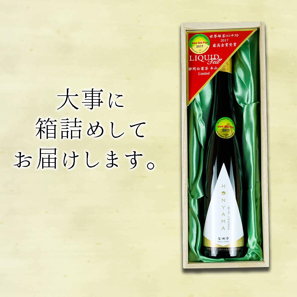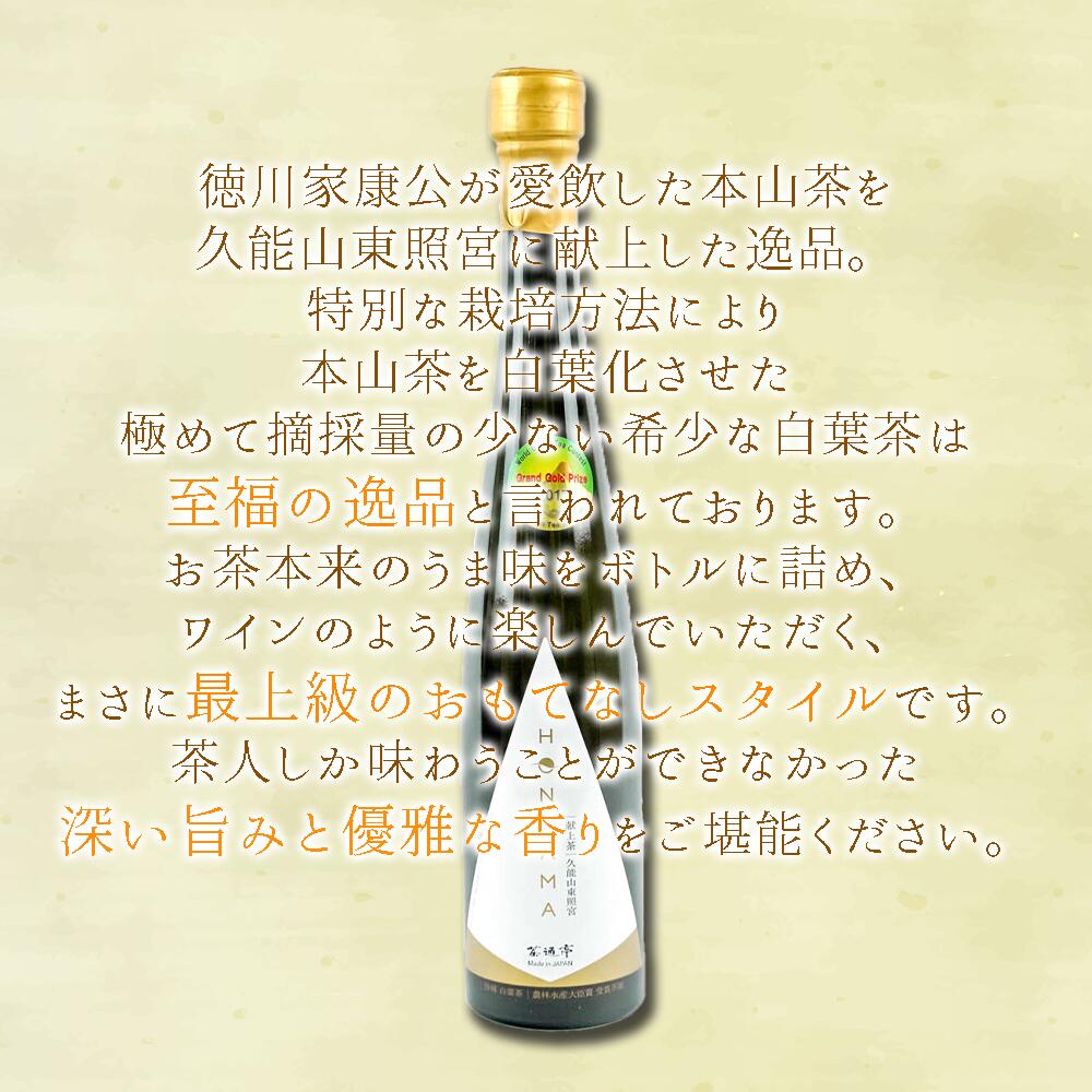返礼品説明 名称 【ふるさと納税】Liquid Tea 献上茶 静岡白葉茶 ほん山 Limited 記念ボトル 内容量  Liquid Tea 献上茶 静岡白葉茶 ほん山 Limited 記念ボトル:375mL 最終加工地 静岡県 養殖・解凍の別 記載事項特になし 消費期限 冷蔵90日 開封後はお早めにお召し上がりください。 保存方法 冷蔵 加工業者名 株式会社静岡茶通亭 返礼品説明 世界緑茶コンテスト最高金賞受賞 徳川家康公が愛飲した本山茶を久能山東照宮に献上した逸品。 特別な栽培方法により本山茶を白葉化させた極めて摘採量の少ない希少な白葉茶は至福の逸品と言われております。 お茶本来のうま味をボトルに詰め、ワインのように楽しんでいただく、まさに最上級のおもてなしスタイルです。 茶人しか味わうことができなかった深い旨みと優雅な香りをご堪能ください。 提供元:株式会社静岡茶通亭 配送について 入金確認後約1か月ほどで発送※父の日のプレゼントとしてお届け希望の方は、その旨を備考欄へのご記入をお願いいたします。 また、返礼品によってはお届け指定を承ることができないものもありますのでご了承ください。「ふるさと納税」寄附金は、下記の事業を推進する資金として活用してまいります。 寄附を希望される皆さまの想いでお選びください。 (1)スポーツを活かした、にぎわい創出とまちづくり (2)リノベーシ