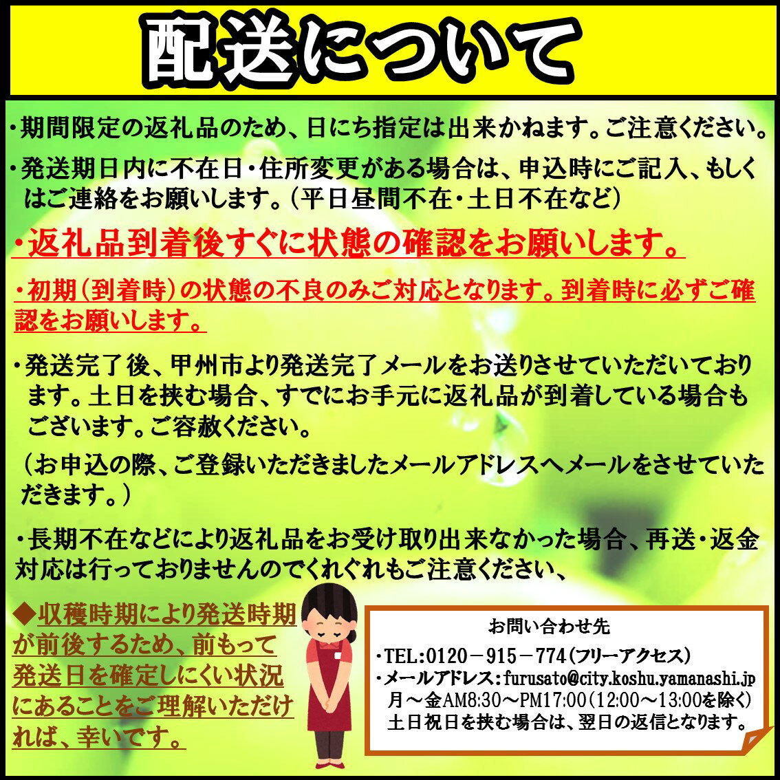 皮ごと食べられて、種も無く、甘みは特徴のシャインマスカット。 新鮮な状態で美味しく食べていただくため発送当日の朝に採れたものをクール便で産地直送しています。 返礼品詳細 品名 シャインマスカット 容量 1kg(2房) 事業者 株式会社 華栄牛産 申込期日 2022年9月30日まで 発送期日 2022年9月上旬~2022年10月中旬頃 ※天候不順での生育状況により発送時期の変動有 配送について ・沖縄・離島へのお届けはできません。 ・返礼品につきましてはご入金確認後、発送元に依頼を行っており、果物の生育状況並び出荷状況に応じ順次発送を行っている為、配送日の指定また、複数品(同種も含む)ご指定いただいた場合も分けて配送する事は出来ません。 ・発送期日内に不在日・住所変更がある場合は、申込時にご入力、もしくはご連絡をお願いします。 (平日昼間不在・土日不在など) ・発送する伝票につきましては「甲州市ふるさと納税事務局」と印字させていただいております。 のし(贈答用)・対応・包装・名入れのご要望・ご対応はお受けしておりません。 ・返礼品到着後すぐに状態の確認をお願いします。 *初期(到着時)の状態の不良のみ再送等の対応となりますので、到着時に必ずご確認をお願いします。 ◆収穫時期により発送時期が前後するため、前もって発送日を確定しにくい状況や、寄附者様に良い状態で果物を楽しんでいただ