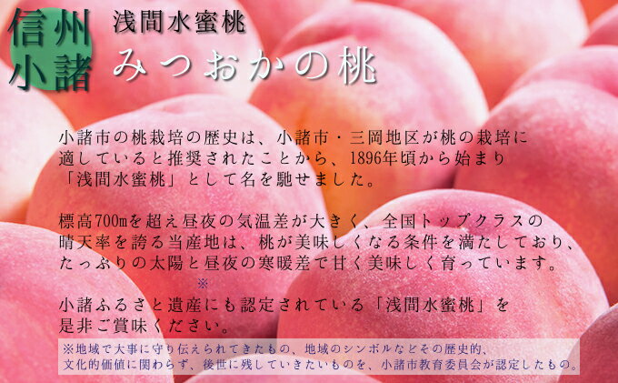名称みつおかのもも【あかつき】約5kg内容量浅間水蜜桃 あかつき 秀品 約5kg※小玉〜中玉の大きさをお送りいたしますので、ご了承ください。※お早めにお召し上がり下さい。産地長野県小諸市消費期限別途商品ラベルに記載事業者佐久浅間農業協同組合あさま果実共撰所配送方法冷蔵配送お届け時期2022年7月下旬〜8月中旬 ※天候によりお届け時期が前後する場合があります。備考※画像はイメージです。※天候や生育状況により、記載の配送時期が前後する場合がございます。※出荷時期になりましたら、別途メールにてお届けについてのご案内をさせて頂きます。 ・ふるさと納税よくある質問はこちら ・寄附申込みのキャンセル、返礼品の変更・返品はできません。あらかじめご了承ください。【ふるさと納税】浅間水蜜桃 みつおかのもも あかつき 秀品 約5kg 【果物・もも・桃・フルーツ・水蜜桃・長野県産・小諸ふるさと遺産】 お届け:2022年7月下旬〜8月中旬 ※天候によりお届け時期が前後する場合があります。 小諸市の桃栽培の歴史は1896年頃より始まり、「浅間水蜜桃」として名を馳せました。小諸市は長野県東の玄関口に位置し、標高は700mを超えるため、昼夜の寒暖差が大きいのが特徴です。併せて全国トップクラスの晴天率を誇っているため、小諸の桃は太陽の光をたっぷり浴びて育っています。小諸ふるさと遺産にも認定された「浅間水蜜桃」にル