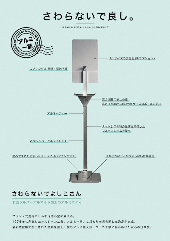 プッシュ式消毒ボトルを足踏み型に変える。1974年に創業したアルシャン工業とリージョンポートの共同製作。最新設備で加工された材料を富士山麓のアルミ職人が一つひとつ丁寧に組み上げた安心の日本製。シルバーアルマイト仕上げの清潔感際立つアルミボディは飲食店、オフィス、病院やイベントなど様々な場所や場面にとけこむシンプルデザイン。様々なボトルサイズにも対応してます。 ※アルミ製A4サイ・・・