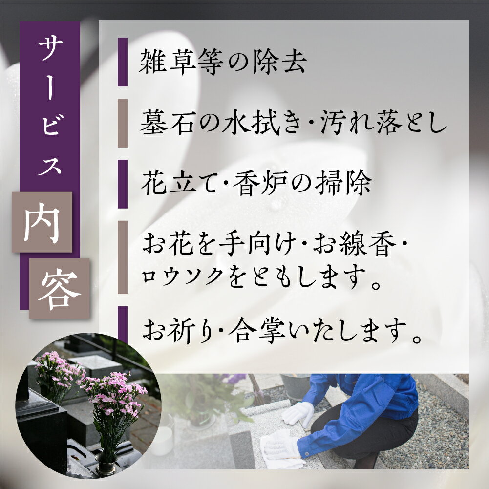 商品説明 名称高山市のお墓のお掃除・お参り代行サービス 商品詳細 「地元のお墓が気になるけど、遠くてなかなかお参りに行けない。」「高齢で掃除が大変になってきた。」などお墓のお掃除・お参りが難しい方のための代行サービスです。【サービス開始の流れ】ご寄附いただいた後、当社からご案内・申込書を送付させていただきます。ご確認いただき、必要事項をご記入の上、返信用封筒でお送りください。その後当店より連絡させて頂きますので、作業日程・作業場所などお話し合いのうえ決定させていただきます。●お問い合わせ・お申し込みサービスを行うお墓は岐阜県高山市内にあるお墓に限ります。作業内容やご契約内容などご不明な点などございましたらお気軽にご相談くださいませ。[株式会社一善]電話番号:0577-34-5755メールアドレス:contact@ichizen.jp●メール・お電話にて打ち合わせ場所等の確認・作業内容等、詳細を打ち合わせさせていただきます。●ご指定の日に作業を開始させていただきます。場所確認等で当日ご連絡を差し上げる場合がございます。※寄附のタイミングによって、来年4月〜10月の作業になる場合がございます。●作業報告作業終了後、郵送にて作業前及び作業後のお写真とともに作業完了書をお送りさせていただきます。■お店・事業者紹介弊社は、葬儀・イベント・墓地墓石事業の3部門から形成されており、『ゆりかごから