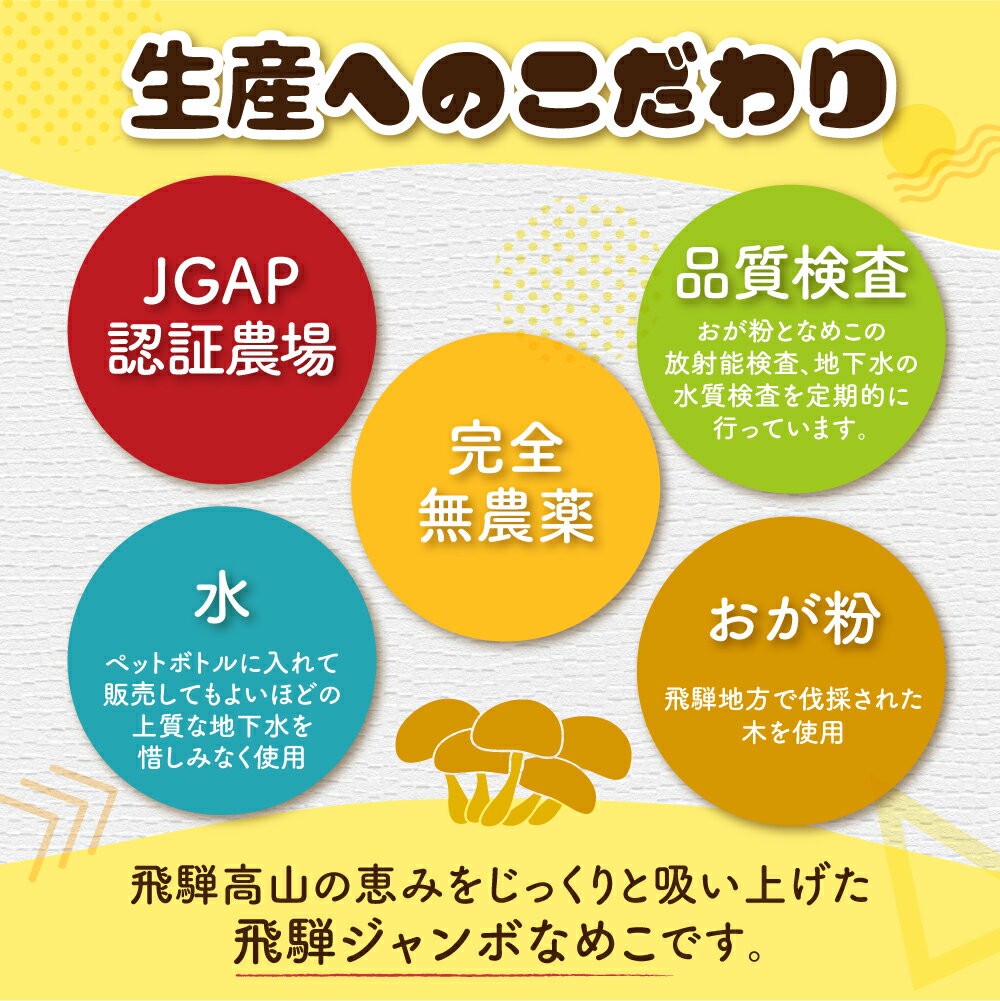 商品説明 名称飛騨ジャンボなめこ 10パック 商品詳細 天然ものにも負けないなめこを! 標高500m以上の高地で、東京都とほぼ同じ面積の飛騨高山。 でもその面積の約9割は森林で、そんな恵まれた飛騨高山の森林の資源に感謝しながら、きのこ作りをしています。 栽培に使用されるおが粉は飛騨地方で伐採した木を使用。水は上質な地下水を使用しております。 年に一回、おが粉となめこの放射能検査、近隣の田からの農薬のドリフト被害の可能性を考えて残留農薬検査、自社の地下水の重金属や大腸菌も含めた水質検査を行い、直近の結果はいずれも不検出! 安全性が裏付けされています。 安心安全な原材料を使用し、低温で熟成することにより、飛騨高山の恵みをじっくりと吸い上げた美味しいなめこになります。 噛むほどになめこ本来の風味と食感をご堪能いただけます。 ■食べ方 鍋、汁、炒め、焼き、BBQ、揚げ物、麻婆、麺類、炊き込みご飯など幅広くご使用いただけます。 必ず75℃以上で1分以上加熱してお召し上がりください。 ■保管方法 到着後は冷蔵庫で保管して、5日以内にお召し上がりください。 冷凍も可能ですが、解凍せずに加熱することをおすすめします。解凍してもお召上がりいただけますが、黒く変色し、食感も柔らかくなります ■お店・事業者紹介 飛騨ジャンボなめこを飛騨高山から全国へ出荷 岐阜県唯一のなめこ工場 JGAP認証農場 年間約
