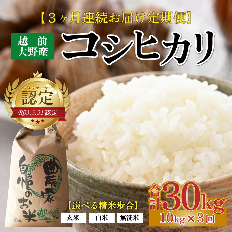 【ふるさと納税】【先行予約】【令和4年産新米】【3ヶ月定期便】越前大野産 エコファーマー認定農家栽培 コシヒカリ 10kg × 3回 計30kg お米・こしひかり・金賞【2022年10月より順次発送開始予定】 [E-001003]・・・