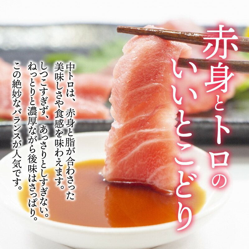 冷凍とは思えない驚きの旨さ。 最新の冷凍技術を採用することで、鮮度抜群の上質なお刺身を自宅でいつでも堪能できます。 本まぐろは肉質が非常にまろやかでコクがあり、うま味が強いことが特徴です。 ポイント1:赤身とトロのいいとこどり 中トロは、赤身と脂が合わさった美味しさや食感を味わえます。 しつこすぎず、あっさりとしすぎない。 ねっとりと濃厚でありながら後味はさっぱり。 この絶妙な・・・