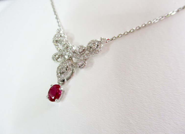 エレガントなデザインに情熱的な石、ルビーが揺れる、大人の女性に身に付けて欲しいペンダントです