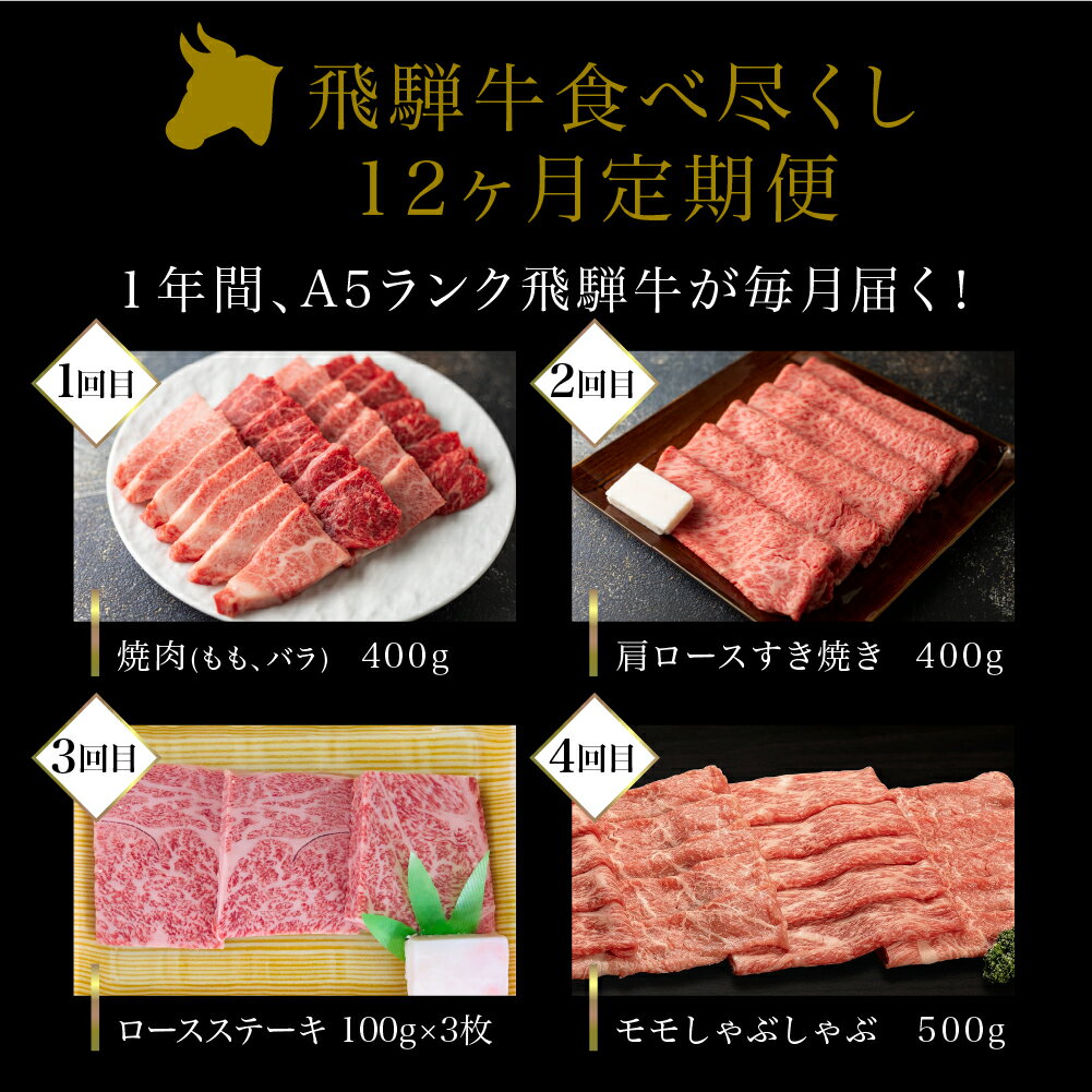 商品説明 名称【定期便】A5ランク飛騨牛食べ尽くし12ヶ月定期便 商品詳細 【定期便】A5ランク飛騨牛食べ尽くし12ヶ月定期便 美しい水、豊かな自然に育まれ、大切に仕上げられた飛騨牛。芸術的なほどの美しい霜降、脂質は甘みがあり、しつこくなくさらりとして食べやすい。全国和牛共進会(和牛オリンピック)では最優秀賞も受賞しており、日本を代表するブランド牛となっております。この定期便では12ヶ月毎月こだわりの厳選飛騨牛をお届け!5等級の中でも上物だけを仕入れている当店の飛騨牛は美しい霜降、とろけるような脂の甘み・旨味に自信があります。中でも霜降りの美しい最とび飛騨牛はこの定期便の目玉です。12ヶ月目の最後には当店の最高級部位の牛ヒレステーキをご用意致しました。毎月異なった部位やお召し上がり方で飛騨牛の良さを更に知っていただける様な内容になっております。ご注文を頂いてから、お肉をカットしすぐに発送しますので、切り立ての美味しさをそのままお届け!是非ご賞味下さい。 産地名 内容量 【1回目】飛騨牛焼肉(もも、バラ)400g ※冷凍 【2回目】飛騨牛肩ロースすき焼き400g ※冷凍 【3回目】飛騨牛ロースステーキ100g×3枚 ※冷凍 【4回目】飛騨牛モモしゃぶしゃぶ500g ※冷凍 【5回目】最とび飛騨牛サーロインステーキ300g×2枚 ※冷蔵 【6回目】飛騨牛ロースすき焼き400g ※冷凍
