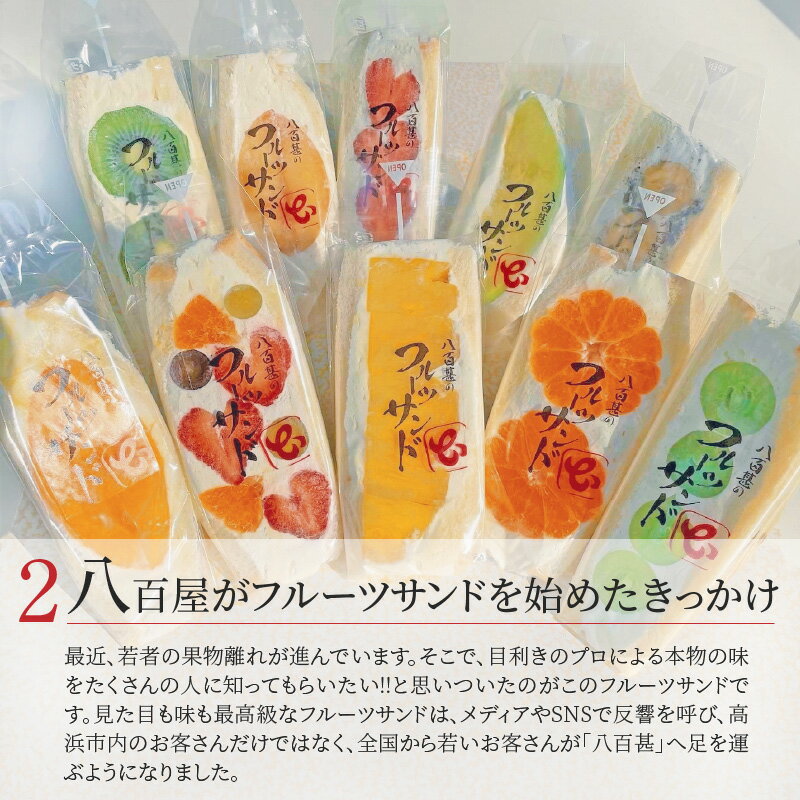 季節ごとに厳選したフルーツを一番いいタイミングでサンドしました。創業から100年以上続く八百屋「八百甚のフルーツサンド」フルーツのプロとして、伝統の目利きで仕入れたフルーツを使用しているので、味は絶品です。八百甚のフルーツサンドは見た目よし、味よし、文句なし!!※配送日の指定は出来ません。固定のお届け日に確実にお受け取りできる方のみお申込みください。※時間のご指定は出来かねます・・・