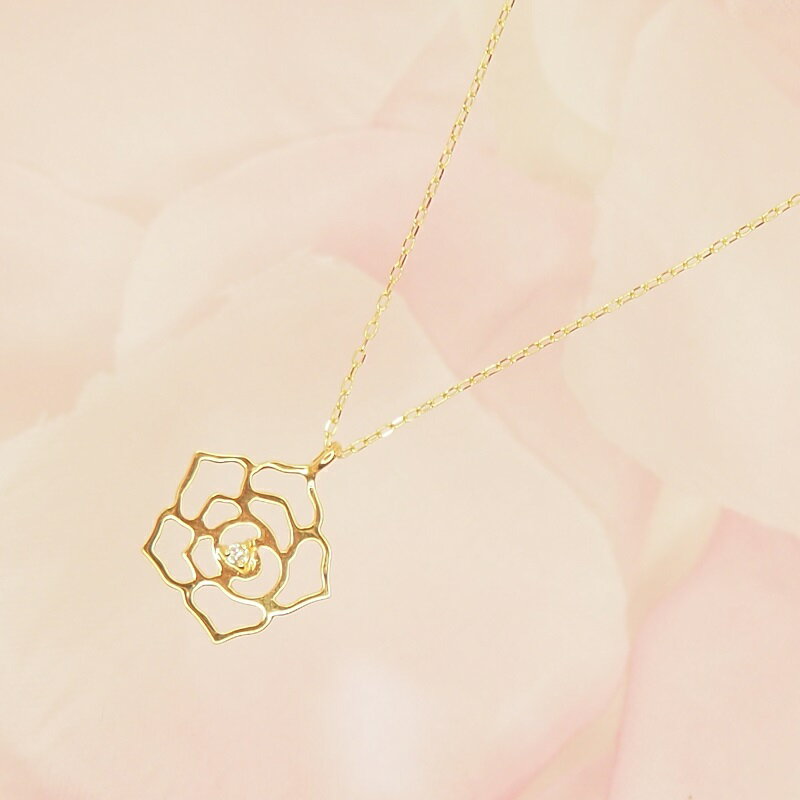 厳選されたダイヤモンドを0.01ct使用した薔薇モチーフのネックレス。 愛を伝える花のモチーフで胸元で輝きエレガントに着けれるアイテム。 山梨県甲府市で一貫して作成した商品。 『宝石の街 甲府』に立地します当社は、創業以来70年余りの永きに渡り宝飾品を一貫して製造販売しており、金やプラチナをはじめ、地金から職人が一工程ずつ確かな技術により裏打ちされた製品を仕上げております。『職・・・