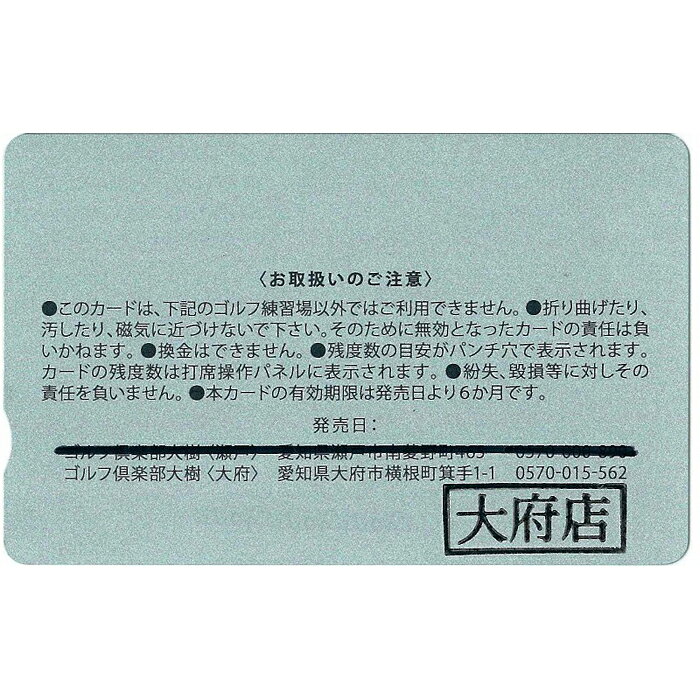 ・ふるさと納税よくある質問はこちら ・寄付申込みのキャンセル、返礼品の変更・返品はできません。あらかじめご了承ください。 ・ご要望を備考に記載頂いてもこちらでは対応いたしかねますので、何卒ご了承くださいませ。 ・寄付回数の制限は設けておりません。寄付をいただく度にお届けいたします。 名称 【日本最大級 400打席 ゴルフ練習場】ゴルフ倶楽部大樹 大府店 施設利用券 【12,00・・・