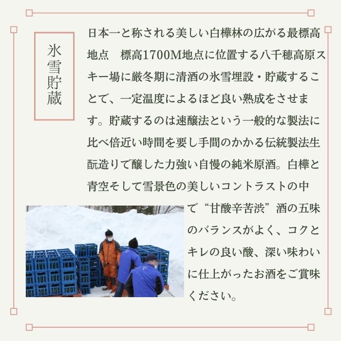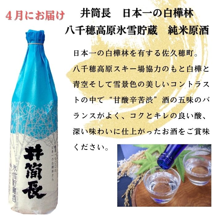 信州北八ヶ岳山麓・千曲川上流 標高八百メートルの高原のまち 佐久穂町。 全国の酒造場の中でも屈指の高所に立地し、厳しくも恵まれた自然と澄んだ空気、冷涼な気候。 そして良質で水量豊富な軟水の千曲川伏流水(自社井戸)を活かして、安政五年(一八五八年)の創業より、郷里に根付いた酒造りをしております。 信州北八ヶ岳山麓の恵まれた自然の中、エネルギー負荷が少なく、冷蔵貯蔵とは一線を画し特殊な環境下で貯蔵・熟成した純米酒を旬に合わせてお届けします ※異なる規格の純米酒を環境に合わせ貯蔵熟成させています。 ※貯蔵の環境によりキャップ等にカビが付着している場合がございます。 名称 北八ヶ岳の自然を生かした貯蔵酒 定期便 年3回お届け 内容 4月:3ヶ月間、八千穂高原で氷雪貯蔵した純米生原酒(1本)・・・720ml 9月:4か月間、県営余地ダム管理施設内でダム熟した特別純米ひやおろし(1本)・・・720ml 11月:7か月間、かつて氷室として使われていた松原湖畔の室(ムロ)で貯蔵した生もと純米原酒(1本)・・・720ml 720ml 各1本 3種 合計2,160ml 発送時期 4月、9月、11月の3回のお届けとなります。 賞味期限 開封後、お早めにお召し上がりください。 事前にお読みください ・寄附後のキャンセル、返礼品の返品はお受けしておりません。 ・お届け時期に住所変更等ございましたら長