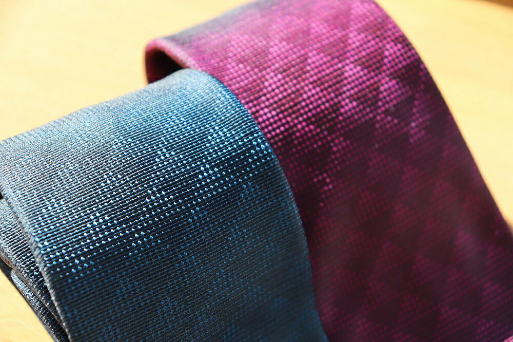 光によってさりげない富士のシルエットが浮かぶネクタイです 自社生産、自社販売を行っています。 お客様と接することも多々あり、その声を商品作りに反映させています。 ネクタイは、普段から動物やいろいろな物、事をモチーフにデザインし生地を織っています。 ちょっと変わった柄になりがちですが、奇抜にならず普通に使えるように柄や色を工夫しています。 この富士山柄は、すっかり暗くなった仕事帰・・・