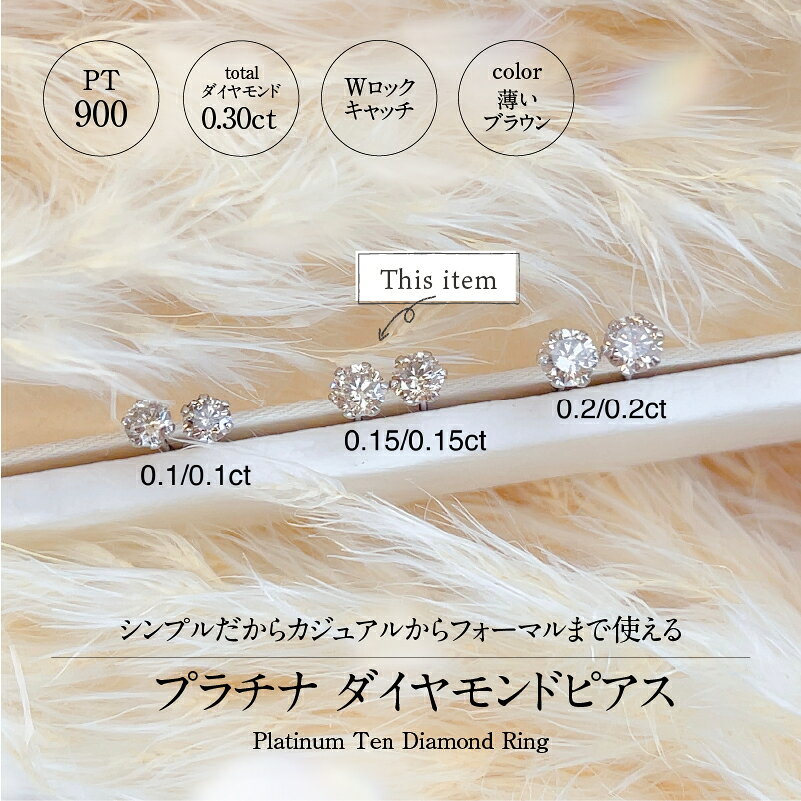 定番のシンプルな6本爪のスタッドピアス0.30ctのダイヤがキラキラと輝きます。 カジュアルからフォーマルまで幅広く使えるデザインです。 名称 プラチナ(トータル0.30ct) ダイヤピアス 403101 内容 ・本体:PT900 ・ダイヤモンド2石:トータル0.30ct (ダイヤモンドカラー:薄いブラウン) ・キャッチ:Wロックキャッチ付き ・カード鑑別書付き 注意事項 ※写・・・