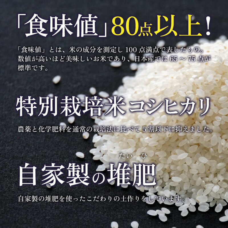 こだわりに、こだわりに、こだわりぬいた南条米。水にこだわり、土にこだわり、味にこだわり、南条産にこだわった、自慢のお米です。 ◆「食味値」は80点以上! 「食味値」とは、米の成分を測定し100点満点で表したものです。数値が高いほど美味しいお米であり、日本産では65~75点が標準です。 ◆減農薬・減化学肥料の特別栽培米コシヒカリです。農薬と化学肥料を通常の栽培法に比べて5割以下に・・・