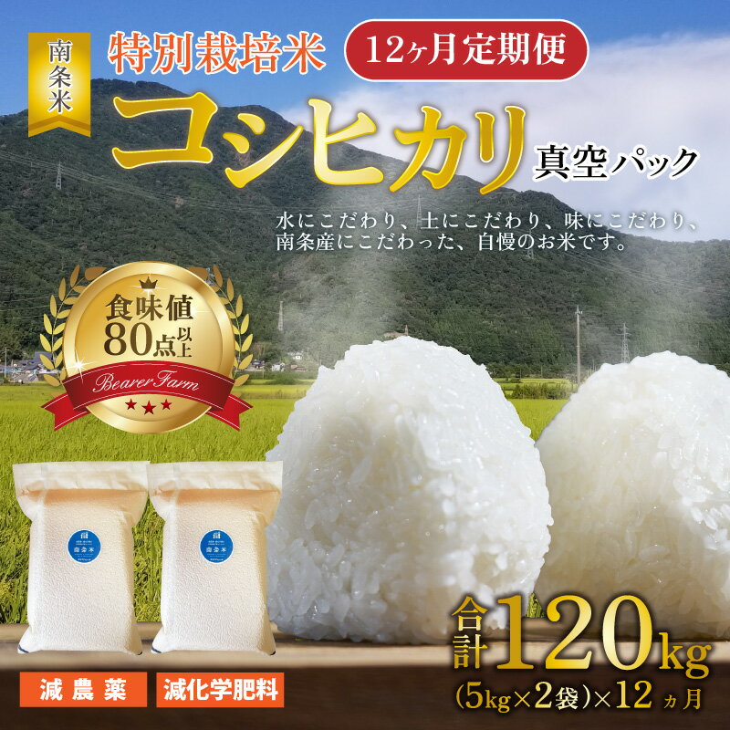 こだわりに、こだわりに、こだわりぬいた南条米。水にこだわり、土にこだわり、味にこだわり、南条産にこだわった、自慢のお米です。 ◆「食味値」は80点以上! 「食味値」とは、米の成分を測定し100点満点で表したものです。数値が高いほど美味しいお米であり、日本産では65~75点が標準です。 ◆減農薬・減化学肥料の特別栽培米コシヒカリです。農薬と化学肥料を通常の栽培法に比べて5割以下に抑えました。 ◆自家製の堆肥を使ったこだわりの土作りをしています。 ◆精米したてのおいしさを味わえる真空パックでお届けします。真空パックのお米は長期保存もできるので、備蓄用のお米としてもおすすめです。なお、精米後に小米選別機、色彩選別機で着色米や欠けたお米を取り除いてます。 ◆合同会社ベアラファーム 主な栽培作物は水稲、大麦、大豆、エダマメで、近年は自然薯や落花生も栽培しています。南越前町の気候風土が育んだ、安心安全な農産物をたくさんの方に食べていただきたいです。 【注意事項】 ※GW/お盆/年末年始休業日は発送までの日数には含まれません。 商品詳細 名称 【ふるさと納税】【新米】【12ヶ月連続お届け】南条米 特別栽培米コシヒカリ 真空パック 10kg(5kg×2袋)×12ヶ月 (計120kg) 内容量 南条米 特別栽培米コシヒカリ 真空パック 10kg(5kg×2袋)×12ヶ月 (計120kg) 配送方法