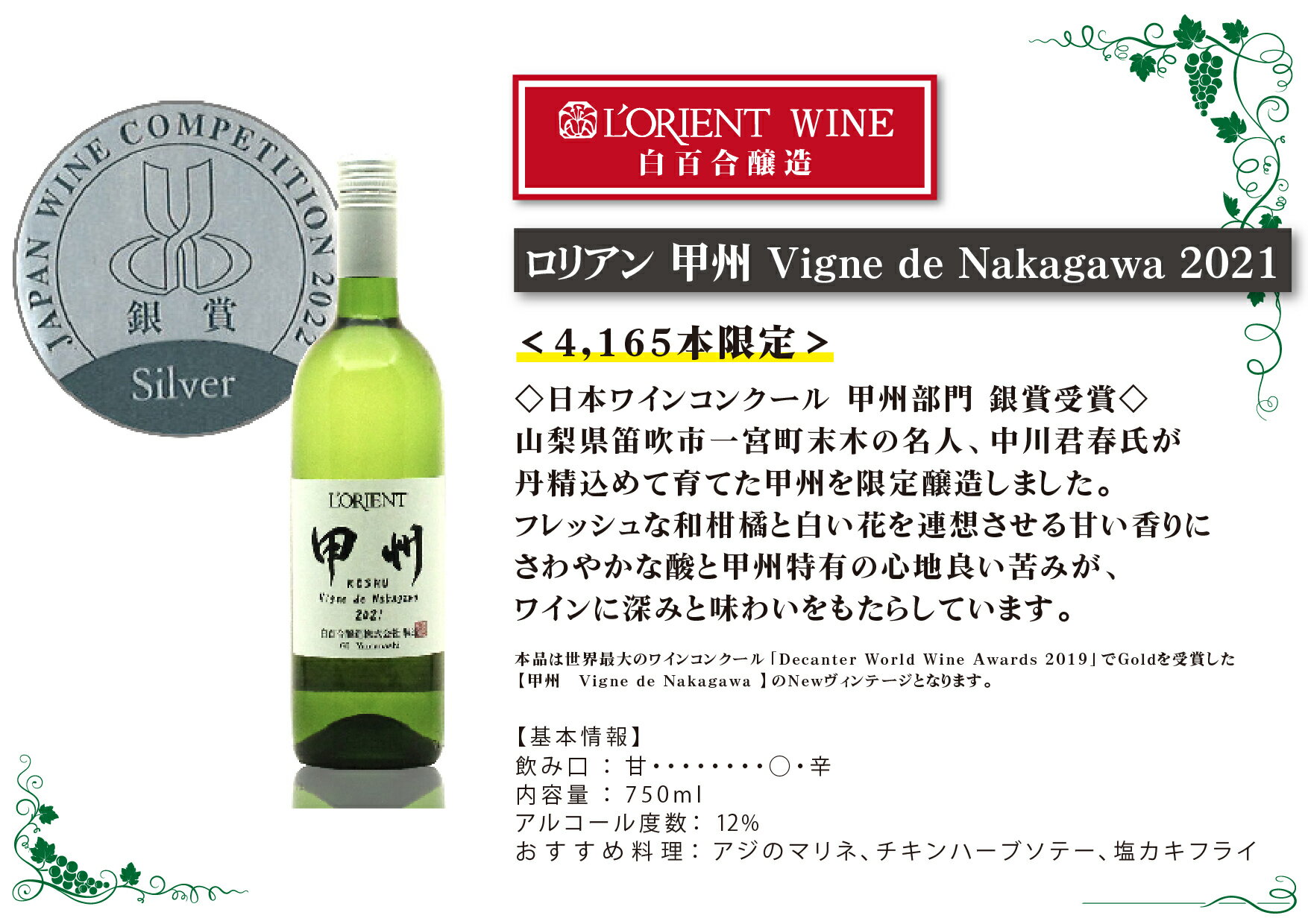 【甲州 Vigne de Nakagawa 2021】 ー山梨県笛吹市産ぶどう使用ー 世界最大のワインコンクール「Decanter World Wine Awards 2019」でGoldを受賞した 【甲州 Vigne de Nakagawa 】のNewヴィンテージです! 2022年も受賞致しました! ◇日本ワインコンクール 甲州部門 銀賞受賞 山梨県笛吹市一宮町末木の名人、中川君春氏が丹精込めて育てた甲州を限定醸造しました。 フレッシュな和柑橘と白い花を連想させる甘い香りにさわやかな酸と甲州特有の心地良い苦みが、ワインに深みと味わいをもたらしています。 <限定_4,165本> ↓↓前ヴィンテージ「甲州Vigne de Nakagawa2020」は以下の賞を受賞致しました。↓↓ ◇Decanter World Wine Awards 2021 BRONZE受賞 ↓↓前ヴィンテージ「甲州Vigne de Nakagawa2019」は以下の賞を受賞致しました。↓↓ ◇Decanter World Wine Awards 2020 BRONZE受賞 ◇Japan Wine Challenge 2020 GOLD受賞 ↓↓前々ヴィンテージ「甲州Vigne de Nakagawa2017」は以下の賞を受賞致しました。↓↓ ◇Decanter World Wine Awards 2019 Go