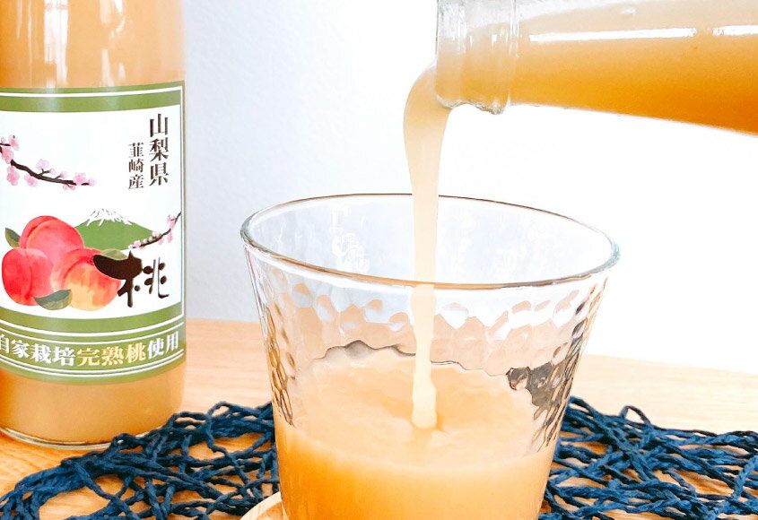加工業者さんが驚いた!「こんなに綺麗な桃で作るの!?」と。 この桃ジュースを加工してくださる業者さんに原料となる桃を持って行った時に言われた言葉です。 原料の桃は糖度13度以上の完熟で綺麗な状態の良い桃を使用しています。 だからとってもおいしい桃ジュースに仕上がりました♪ (※製造工程でどうしても加水が必要なため必要最低限の砂糖が添加されています。) 果汁80%でフルーティー。 桃本来の味を生かしネクターのようにトロリとした舌ざわりで、上品な甘さがありつつ後味はスッキリとしています。 ■山梨県韮崎市の桃の産地『新府地区』で自家栽培した桃で作りました。 除草剤は一切使用せず有機堆肥を施用した土づくりを行い、二重袋を使用して農薬が直接かからないように栽培しています。 ■トロ〜リ濃厚 いろいろなアレンジが楽しめお子様から大人の方まで幅広く楽しんでいただけるジュースです。 【おすすめのアレンジ】 1) 飲むヨーグルトと割る。 2) そのまま凍らせてシャーベットに。 3) バニラアイスやヨーグルトにかけてお子様のおやつに。 4) 桃ジュース2に炭酸水1の割合で割って飲むとパンチの効いた味わいに! ※とっても濃厚ですので開栓前によく振ってください。 また開栓後は冷蔵庫に保存していただき、お早めに召し上がりください。 ■お客様の感想 「スムージーみたいでおいしい。スイーツにも使えそう」(30代