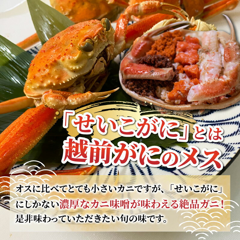 福井県越前町で水揚げされた、わけあり(足の1本無い状態)せいこがに(ズワイガニのメス)220~260gが2杯になります。 蟹は茹でた状態での発送となります。(茹でると身が引き締まり、15%ほど重さが減少します。) より美味しく召し上がれますように、オリジナルかに酢付きです。 越前かに ”わけあり” 専門店 かに楽 ~当店の「わけあり」とは~ ・「わけあり」とは、蟹漁時、水揚げする最中に蟹の足が取れた場合、仕入れて茹でる工程などでとれた場合の蟹を言います。蟹が生息する海中で足を取ってしまい、水揚げ時にセリ時に足が取れている場合は、蟹自体の品質が良くない場合が多く、当店はそういったわけあり蟹は使用いたしません! ・当店の「わけあり」は仕入れてから茹でる工程などで足が1本取れてしまった越前かにです。2本以上足の取れた蟹は、お届けいたしません。 注意事項・その他【必ずお読みください】 ※生け簀での状態や在庫状況により、急遽在庫がなくなる場合がございます。その場合、R5年11月カニ解禁直後でのお届けとなります。ご理解の上、ご寄附いただきますようお願い致します。 ※発送前に事業者から寄付者様へ連絡をいたします。連絡がついた方から順次発送いたしますので、お申し込み時には、日中ご連絡がとれる電話番号を必ずご記入ください。 ※足が取れている場所は、商品によって異なりますので、ご了承ください。 ※お