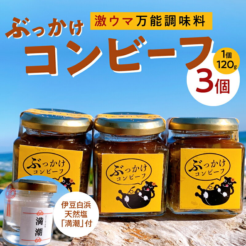 \朝の情報番組や新聞等、多数メディアで紹介されました!/ ◇ぶっかけコンビーフ◇ 株式会社UKAIが運営している焼肉店「特選黒毛和牛牝専門 焼肉U」が開発しました。 UKAI代表の義父が50年間黒毛和牛の牝牛のみの卸業を営んでおり、芝浦食肉卸市場よりA5ランクの黒毛和牛牝牛の中から厳選したものを扱っています。 黒毛和牛のテールと白浜海岸の海水から手作りした天然塩「満潮」を使用し、黒毛和牛の旨味とコクを天然塩で引き立て、そこにニンニクのパンチ力をプラスした万能調味料です。 ご飯にかけるだけでガッツリとお召し上がり頂けます。 また、パスタやチャーハン、カレーにと何にでも合います。 ◇満潮◇ 白浜海岸の海水から手作りした天然塩です。 口に入れると、伊豆白浜の美しい海の優しい香りを感じることができます。塩の粒が細かく、調味料として料理に使うのはもちろん、デザートのアクセントとしてもお使い頂けます。 「満潮」は、伊豆最古の神社(※)で、2400年以上の歴史がある「白浜神社」に毎月奉納しています。 ※伊豆下田観光協会より 【事業者の声】 ご飯にかけるコンビーフ「ぶっかけコンビーフ」は上質なお肉を扱うことが出来る焼肉屋としての強みと、自然豊かな伊豆下田の魅力を詰め込んだお礼品です。 外に出ることが難しい昨今、本お礼品を通して、焼肉Uと伊豆下田の魅力をお届けできればと思います。 「満潮」は、伊豆白