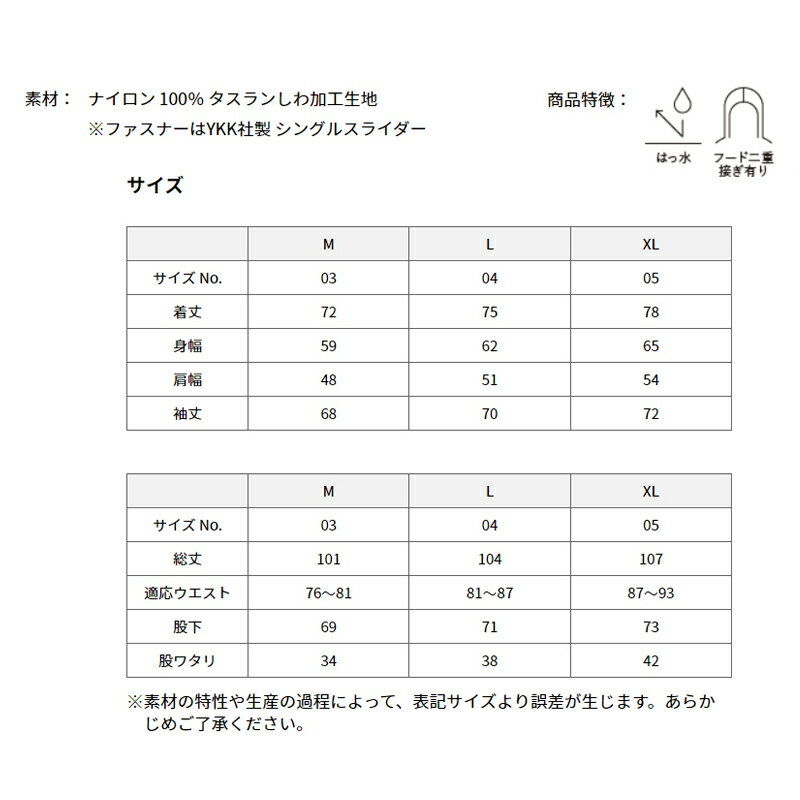 はっ水加工を施したナイロンアノラックパーカーと同素材のナイロンパンツセットアップ。 アウトドア、スポーツミックススタイルに好相性な絶妙なヌケ感がポイントのデザイン。 軽い着心地&生地にシワ加工を施した高級感のある生地です。 フロントビッグポケットは本体をコンパクトにたたむことで収納することが可能です。 またカバンに入れられることができるのでアウトドアや、寒くなった時に重宝します。 ※ファスナーはYKK社製シングルスライダー フロントビッグポケット×1(バッカブル仕様)、サイドポケット×1 パンツは、適度なルーズさを保ちつつ横から見たときに膨らむようなバルーンシルエットとなるようにデザイン。 スニーカーと合わせやすいように裾はゴム仕様となっています。 ※脇ポケットあり、脇縫いなし、ウエスト丸ひもあり(内側)、ヒップポケットあり、裾下シャーリング始末 モデル:168cm グリーン M着用 ・カラー :【ブラック】【ネイビー】【グリーン】 ・素材 :ナイロン 100% タスランしわ加工生地 ・サイズ 【M】【L】【XL】 ※ご希望サイズ&カラーを備考欄にご明記ください ※お申込みのタイミングにより発送までお時間をいただく場合もございます。 ※お申込み後のサイズ交換はご対応いたしかねます。 (REVOLLA) 商品説明 名称 軽い着心地で絶妙なヌケ感がポイントのアノラックパーカー&パンツ