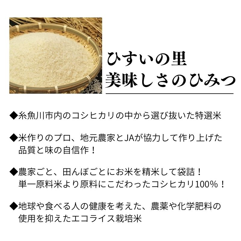 北アルプス白馬連峰・頚城連山(焼山・火打山)から流れる冷たくきれいな水で、 米作りのプロと地元農家とJAが協力して作り上げた自信作!地元コシヒカリを100%使用しています。 一粒一粒がとてもプリプリとしていて、お米の旨味を感じます(^^♪ 地球や人間の健康を考えた、農薬や化学肥料の量を抑えるエコライス栽培を行っています。 商品概要 名称 特選米「ひすいの里」定期便5kg×3回 ・・・