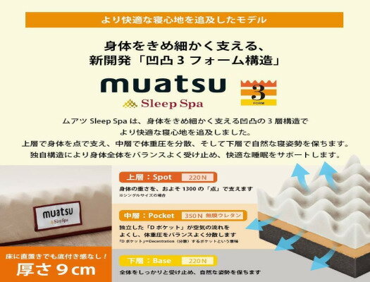 内容サイズ:9X120X200cm 側地:ポリエステル100%(抗菌防臭ポリジン加工) 詰め物:ウレタンフォーム事業者昭和西川株式会社お届け時期入金後1ヵ月程度で発送予定 ※1ヶ月以上お時間をいただく場合がございます。 ・ふるさと納税よくある質問はこちら ・寄附申込みのキャンセル、返礼品の変更・返品はできません。あらかじめご了承ください。【ふるさと納税】[5839-1157]【昭和西川】ムアツふとん スリープスパ ハード セミダブルサイズ 【寝具・敷布団・敷き布団・日用品・雑貨・日用品】 お届け:入金後1ヵ月程度で発送予定 ※1ヶ月以上お時間をいただく場合がございます。 ムアツ「スリープスパ」6つのパフォーマンス ●気持ちいい寝心地 およそ1300の点で支える独自構造です。そのため、身体との接触面積が少なくなり、血行を妨げにくく、寝ている時の身体への負担を軽減させます。 ●理想的な寝姿勢をキープ 上層(A層)、中層(B層)の凹凸の層が2つ重なることにより、どんな姿勢でもきめ細かく身体を支え、自然な寝姿勢を保ちます。 ●バランスよく体圧を分散 「凹凸3フォーム構造」が、受け止めた体重圧を水平・放射状にバランスよく分散。寝ている間ずっと、身体が安定し快適な寝心地を保ちます。 ●寝返りスムーズ 凹凸構造は、スムーズな寝返りもサポートします。寝返りが多い人でも、無理なく穏やかな寝心地を
