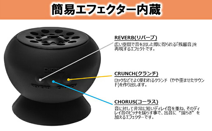 内容[スペック]●梱包寸法:長さ75×幅75×高さ120mm 質量:210g●定格出力:6W●規定入力レベル:INPUT端子:-10dBu(1MΩ)●スピーカー:4cm(1-5/8インチ)●コントロール:リバーブ・ボタン/コーラス・ボタン/クランチ・ボタン●インジケーター:ステータス表示用LED●接続端子INPUT端子:ミニ・タイプ(付属ケーブルによりギターと接続)DC IN端・・・