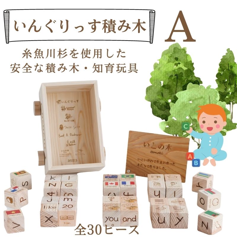 糸魚川の天然杉で作った積み木です。 木の風合いを活かしたシンプルな積み木で、長く遊んでいただくことができます。 アルファベットやイラストで遊びや学びの要素がいっぱい! 楽しく遊びながら、お子様の知的好奇心が刺激されます。 名入れが可能ですので、お子様やお孫様の誕生祝などプレゼントにいかがですか。御出産御祝 出産祝い ご出産祝い 出産祝い お誕生日 プレゼント バースデー クリスマス ギフト 商品概要 商品名 いんぐりっす積み木(全30ピース)A.Bどちらかお選びください 材質 天然杉 適応年齢 A 3歳~B 0歳~(レーザープリントで舐めても安心) 備考 ・写真はイメージです。天然の杉を使い、一つ一つ手作りで作っているため風合い等一つ一つ異なります。・製造時の小さな傷や塗装剥がれがある場合がございますが、不良ではございませんので予めご了承ください。・積み木のデザインプリントは、機械の仕様で線の太さが若干変わる場合がございますので予めご了承ください。 事業者 有限会社 いまいスポーツ ・ふるさと納税よくある質問はこちら ・寄付申込みのキャンセル、返礼品の変更・返品はできません。あらかじめご了承ください。