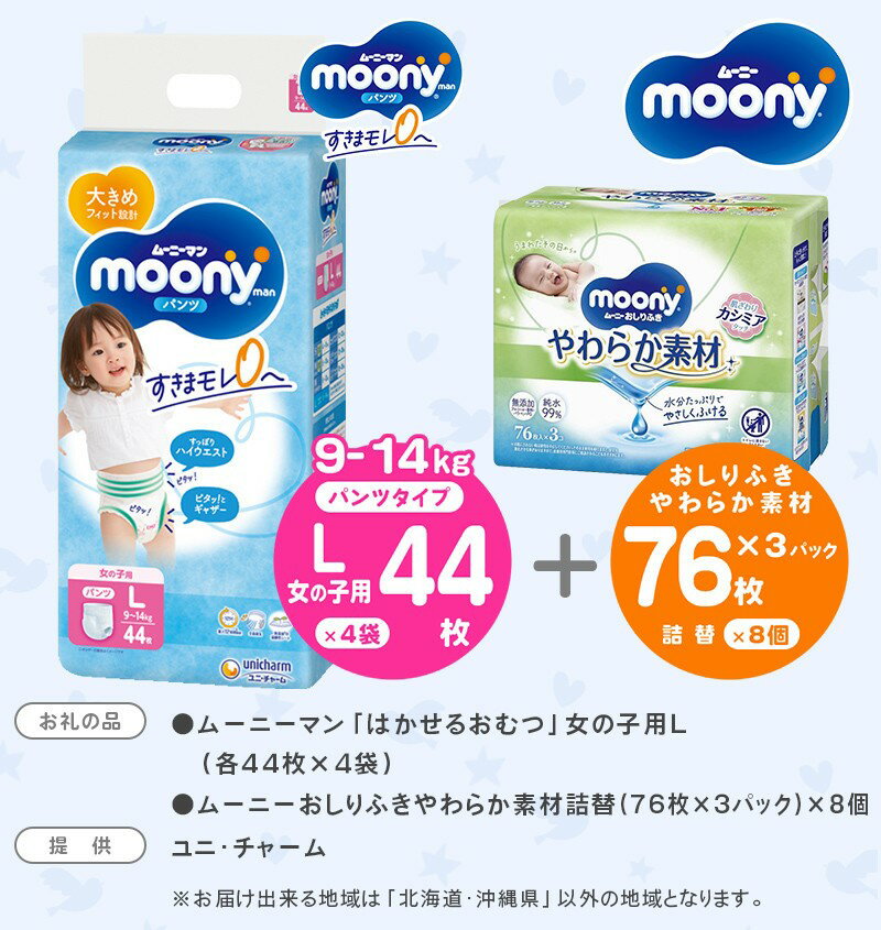 名 称紙おむつ と おしりふき 内容量●ムーニーマン(女の子L) 44枚×4袋 計176枚 ●ムーニーおしりふきやわらか素材詰替 (76枚×3パック)×8個 計1,824枚 適応体重9〜14kg 配送不可地域北海道・沖縄県 販売業者ユニ・チャーム株式会社 ※日中連絡がつく電話番号を必ずご入力ください。※北海道・沖縄県には発送できません ※本サイトに掲載の文章・写真・イラスト・デザイン等の無断転載を禁じます。 ・ふるさと納税よくある質問はこちら ・寄附申込みのキャンセル、返礼品の変更・返品はできません。あらかじめご了承ください。ユニ・チャームムーニーマン「はかせるおむつ」女の子Lサイズ176枚(44枚×4袋)&ムーニーおしりふき やわらか素材詰替 (76枚×3パック)×8個 ムーニーマン「はかせるおむつ」 女の子Lサイズの176枚(44枚×4袋)& おしりふき やわらか素材詰替(76枚×3パック)×8個 Lサイズ 適応体重 9kg〜14kg ムーニーマン「はかせるおむつ」L サイズ 元気に動きまわる赤ちゃんにもズリさがらず、すきまもれゼロへ! ●「すっぽりハイウエスト」ぽっこりおなかの形に合わせてしっかりキープ! だから動いてもすきまもれ安心です。 ●幅広な「ピタッ!とギャザー」で足まわりのすきまもれゼロへ。 ●保湿効果のあるオリーブオイルを配合。 ●「2倍のび~るウエスト
