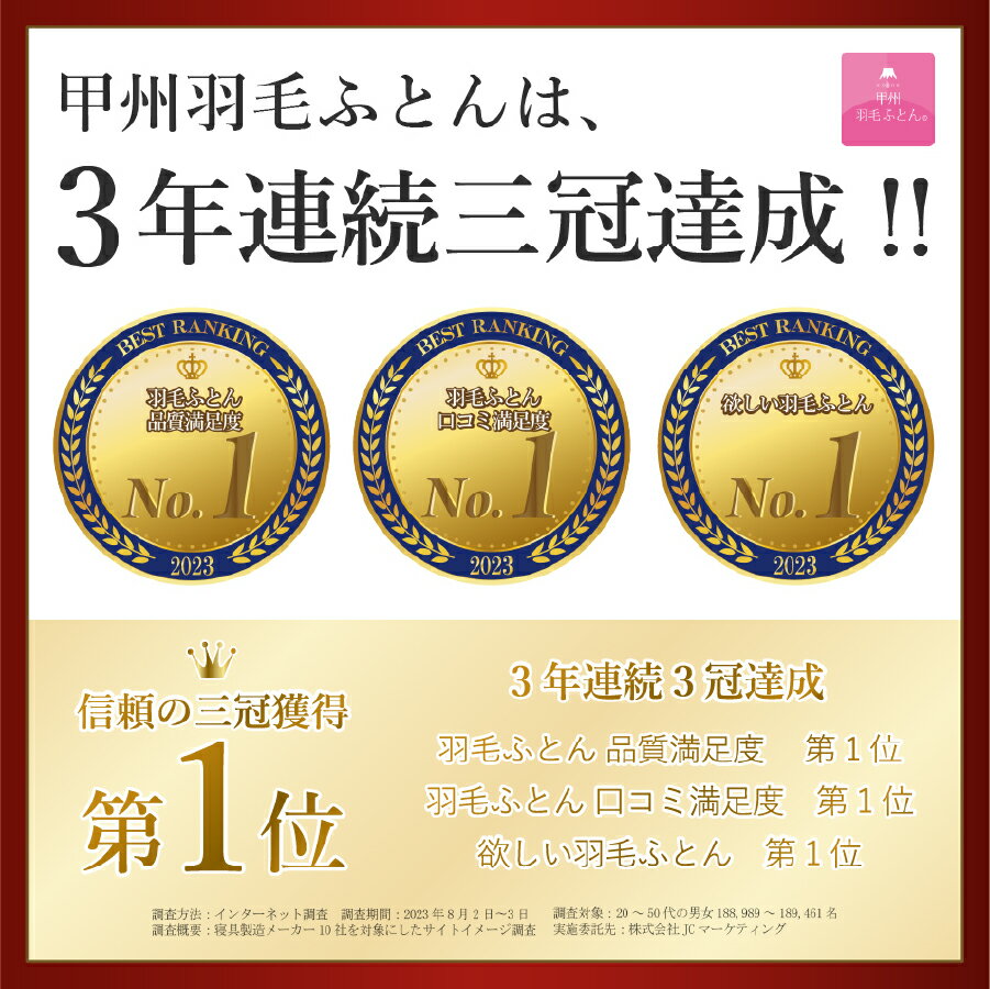 甲州羽毛ふとんは、三冠達成!!(※日本トレンドリサーチ調べ) ・羽毛ふとん品質満足度No.1 ・羽毛ふとん口コミ満足度No.1 ・欲しい羽毛ふとんNo.1 世界遺産「富士山」の麓で作られた高級羽毛合い掛け掛けふとんです。 側生地は軽量なポリエステル交織の高密度生地を使用。防ダニ材を使わずダニの侵入をブロックします。 中身の羽毛は世界の名産地より選び抜いた良質なホワイトダックダウ・・・