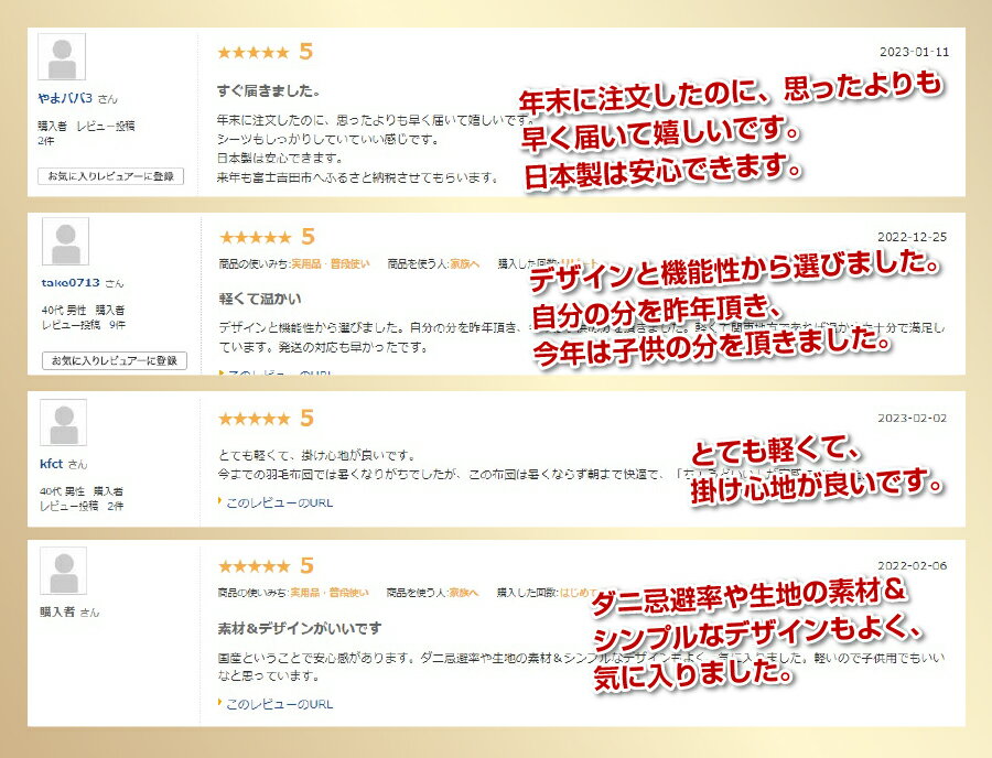 サテン織りの美しい光沢と上品な柔らかさが特徴の超長綿生地と選び抜かれたハンガリー産ホワイトダックダウン375dpの羽毛を使用したこだわりの逸品です。 マンションや全館空調住宅などにぴったりな厚みで取り扱いの便利な羽毛布団。 生地には国内染工所の確かな技術によって抗菌・防臭・防ダニ加工を施している清潔設計です。 Matsuyamaの羽毛布団は、まず絵描士が図案をおこし、配色の調整を行うところから始まります。 次に、生地組成(糸の素材・太さ・織りの密度など)を選定し、生地の風合いや肌触りを決めます。 その後、国内の染色工場にて染め上げ、オリジナルの生地が完成します。 こうして生まれた生地に厳選した羽毛を入れて、羽毛布団が完成します。 サテンストライプの柄は、数多くのホテル・旅館で寝装インテリアとして愛用され、長年にわたり根強い人気を誇っています。 そんな人気のサテンストライプ柄の側生地は、色性や濃度の調整を重ねて、現代住宅のオーク色やナチュラルクリア色の内装にも親和性の高い色に染め上げました。 別売りの枕カバー、布団カバー、フラットシーツと組み合わせて、寝室を上品な空間にコーディネイトするのもおすすめです。 側生地は「綿100% 60番手超長綿(60/1×60/1)」を使用しています。 良質な60番手超長綿で織り上げられた羽毛布団の側生地は贅沢品と言われており、サテン織りの美しい光沢と