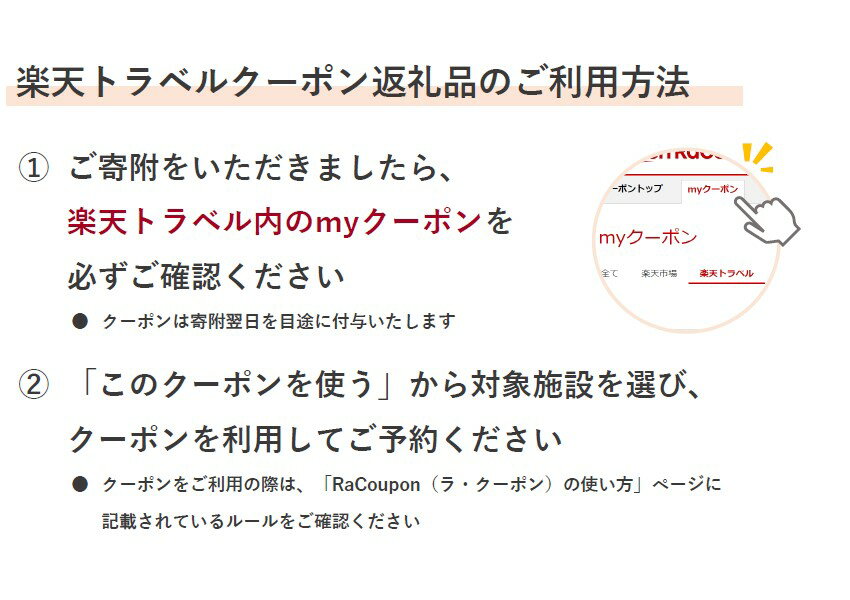 名称 旅行に使える楽天トラベルクーポン 対象施設 使用可能施設は、下記リンクよりご確認ください ★宿泊可能な施設はこちら★ こちらの返礼品の注意事項 ■クーポンの送付はございません。寄付完了後、myクーポンよりご確認ください。 ■クーポンの再発行・予約及び宿泊期間の延長はできません。 提供元 楽天グループ株式会社 ■ふるさと納税は「お買い物」ではなく「寄附」という性質上、申込み・・・