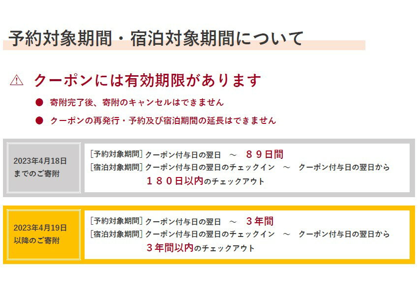 名称 旅行に使える楽天トラベルクーポン 対象施設 使用可能施設は、下記リンクよりご確認ください ★宿泊可能な施設はこちら★ こちらの返礼品の注意事項 ■クーポンの送付はございません。寄付完了後、myクーポンよりご確認ください。 ■クーポンの再発行・予約及び宿泊期間の延長はできません。 提供元 楽天グループ株式会社 ■ふるさと納税は「お買い物」ではなく「寄附」という性質上、申込みのキャンセル・返金、返礼品の返品・交換・再発送はできません。 ■メーカーの都合等により仕様が変更される場合があります。 ■のし・包装・名入れのご希望はお受けしておりません。 ■写真はイメージですので、色調が実物と異なる場合があります。また、小物類は商品に含まれません。 ■ご要望に添えない場合があります。あらかじめご了承ください。 【ふるさと納税のよくある質問は こちら】クーポン情報 寄付金額 50,000 円 クーポン金額 15,000 円 対象施設 長野県野沢温泉村 の宿泊施設 宿泊施設はこちら クーポン名 【ふるさと納税】 長野県野沢温泉村 の宿泊に使える 15,000 円クーポン ・myクーポンよりクーポンを選択してご予約してください ・寄付のキャンセルはできません ・クーポンの再発行・予約期間の延長はできません ・寄付の際は下記の注意事項もご確認ください