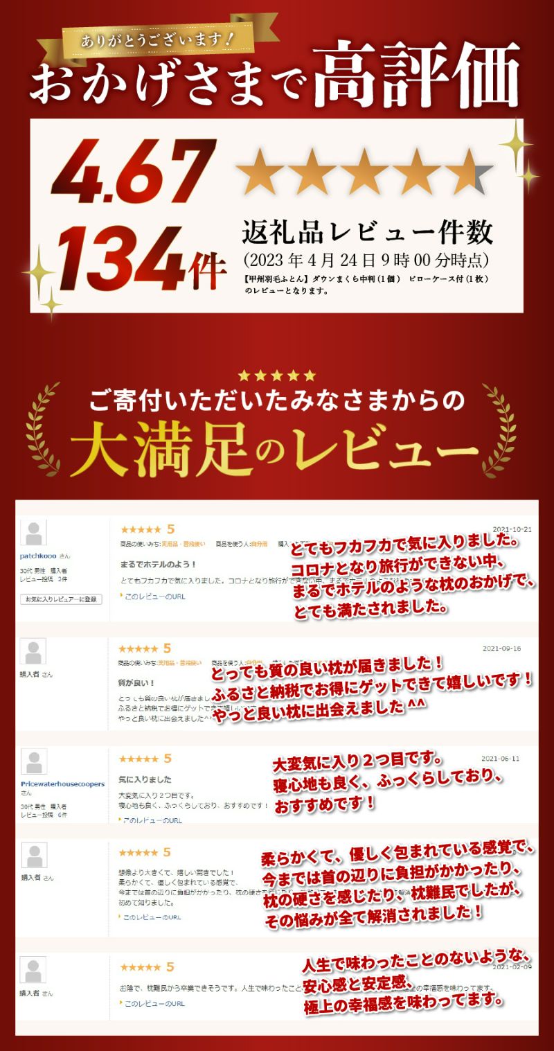 甲州羽毛ふとんは、三冠達成!!(※日本トレンドリサーチ調べ) ・羽毛ふとん品質満足度No.1 ・羽毛ふとん口コミ満足度No.1 ・欲しい羽毛ふとんNo.1 世界遺産「富士山」の麓で作られた高級ダウンまくら 丁寧に洗浄したダウン50%の羽毛をたっぷり600g使用し、熟練の職人がひとつずつ大切に仕上げた逸品です。 がわ生地は肌触りがよく、光沢がある超長綿100%のサテン織りを使用。二重合わせ生地構造で羽毛の吹き出しを防止します。 また、高密度織物のため防ダニ材を使わずダニの侵入をブロックします。サイズは中判サイズ(ヨコ63cm×タテ43cm)。横部分にマチの無いプレーンタイプです。 柔らかく、ふっくらとしたタイプのまくらがお好みの方にお勧めします。専用ピロケース付きでお届けします。 〜甲州羽毛ふとんとは〜 豊富な天然水で磨かれた羽毛を熟練の職人が一枚一枚丁寧に仕上げた商品です。 甲州羽毛ふとん?は、長年の歴史と文化を継承し培われた技術と信頼に基いて、安心・安全なものづくりをしています。 世界遺産「富士山」の大自然の恩恵を受け、天然水で磨かれた羽毛ふとんをぜひお楽しみください。 〜history〜 富士山の北麓地域は古くから織物業が盛んな地域で、その歴史はおよそ1000年前にまで遡ります。 特に甲州絹織物のふとん地は国内有数の産地として名を馳せていました。 1970年台に入り日本に羽毛ふ
