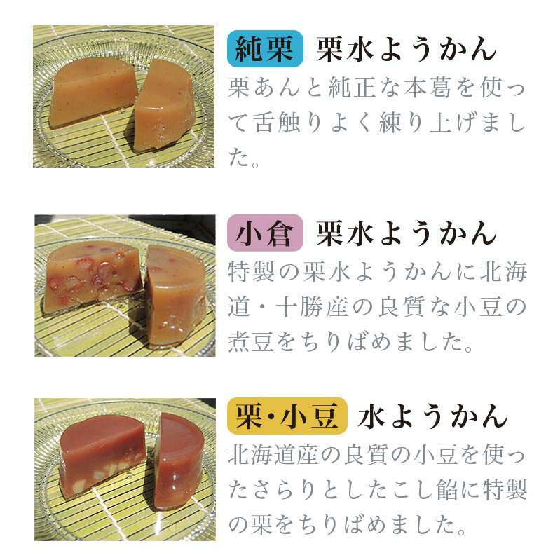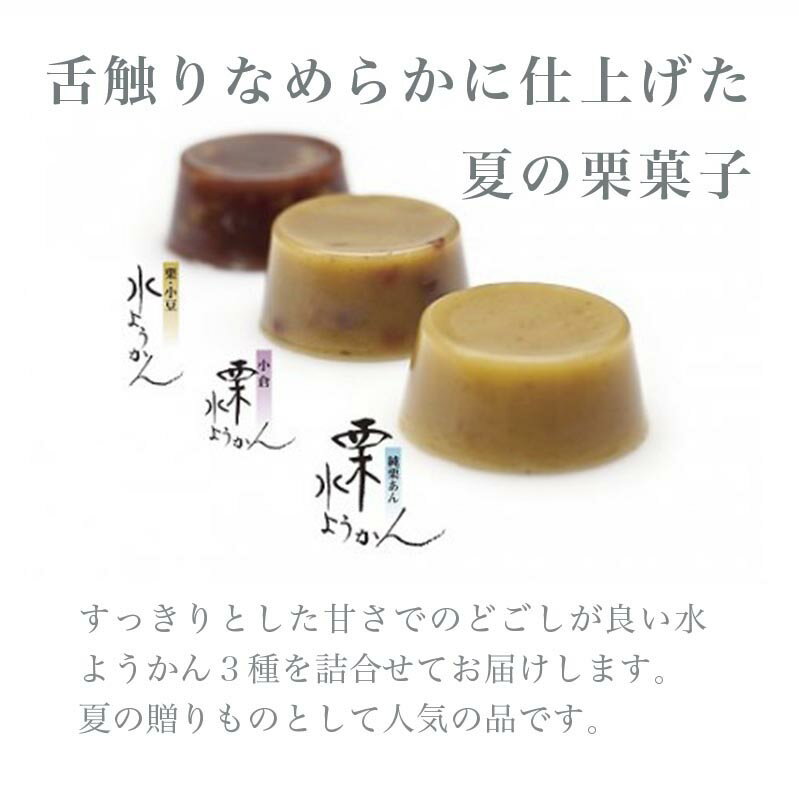 栗餡と本葛を使って舌触りよく練り上げた「純栗 栗水ようかん」、特製の栗水ようかんに良質な小豆の煮豆をちりばめた「小倉 栗水ようかん」、また、さらりとしたこし餡に栗をちりばめた「栗・小豆 水ようかん」。 舌触りなめらかに仕上げた夏の栗菓子。食べ比べも楽しい3つの味をご用意しております。 提供:桜井甘精堂 名称 和菓子 内容量 純栗 栗水ようかん85g×3個栗水ようかん小倉80g・・・