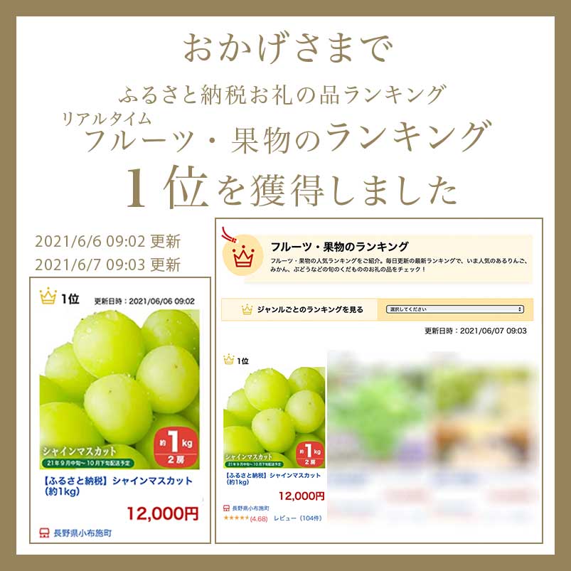種がなく皮ごと食べられる人気の商品です。マスカット香の芳醇な香りと強い甘みは格別です。 小布施町のシャインマスカットの収穫時期は概ね9月中旬以降~11月頭となります。 気候の関係で、全国の中でも、また長野県内においても、小布施町は出荷時期が比較的遅めのエリアです。 自然のものゆえ、生育環境、日当たりや気候条件、果物自体の個体差など、見計らいながら、食べ頃を的確に判断し、順次収獲・・・