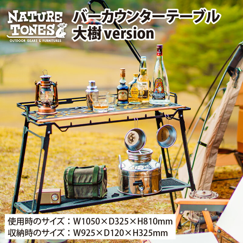 バーカウンターテーブル 大樹version ネイチャートーンズの代表ギアの「バーカウンターテーブル」が新しくTAIJYU versionとなって登場。 新たに搭載した『ランタンハンガー』は、夜でもテーブルを明るく照らしてくれます。 また、シェラカップなどが掛けれる『フロントハンガー』『下網』にはジャグなどその他のアイテムを置いておくことが可能です。 【ご使用上の注意】 ※製品上・・・