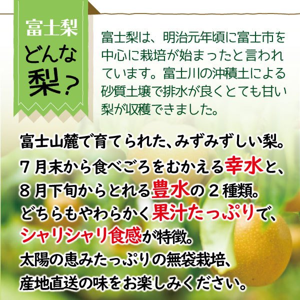 富士梨(3Kg)の詰め合わせです。 富士市内で栽培された梨(幸水・豊水・秋月)で、市場にもあまり出ない貴重な商品です。 商品説明名称梨産地名 富士市内容量約3kg(7玉前後) 保存方法冷蔵庫で保存 販売者 富士川まちづくり株式会社静岡県富士市岩淵1488-1注意事項 ※天候により収穫、発送期間が前後することもございます。 ・ふるさと納税よくある質問はこちら ・寄附申込みのキャン・・・