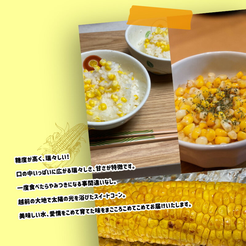 本返礼品は「期間・数量限定」となっております。 ※定数に達し次第、締め切らせていただく事をご了承ください。 発送期間:7月上旬~7月下旬 ※2023年7月上旬から順次発送いたします。 美味しい状態をお届けしたいため、7月のみの短期間の限定発送品です。 糖度が高く、瑞々しい!口の中いっぱいに広がる瑞々しさ、甘さが特徴です。 一度食べたらやみつきになる事間違いなし! 越前の大地で太陽の光を浴びたスイートコーン。 美味しい水、愛情をこめて育てた味を真心こめてお届けいたします。 農場より「採れたての御馳走」をお届け! クロダ農園は、福井県丹生郡越前町に位置し、自然豊かな山中で農業を営んでいます。 越前の大地で太陽の光りを浴びた野菜。美味しい水、愛情をこめて育てた味を真心こめてお届けいたします。 土作りでは微生物や有機物、ミネラル肥料がたっぷり含まれた良質な堆肥を使用しております。 私たちクロダ農園のテーマは『もっと自然のそばに』 色々な事が自宅で出来るようになっている現代ですが、自然を身近に感じる時間が減っていると感じています。 そんな自然をもっと気軽に感じられる場所を作りたい。 子供たちの食育に役に立ちたいと考え、野菜を栽培しております。 【調理方法】 ラップをして、そのまま電子レンジ(600W)にて1本あたり、3分30秒ほど加熱してください。 手軽に手間なく美味しさをご堪能いただけます