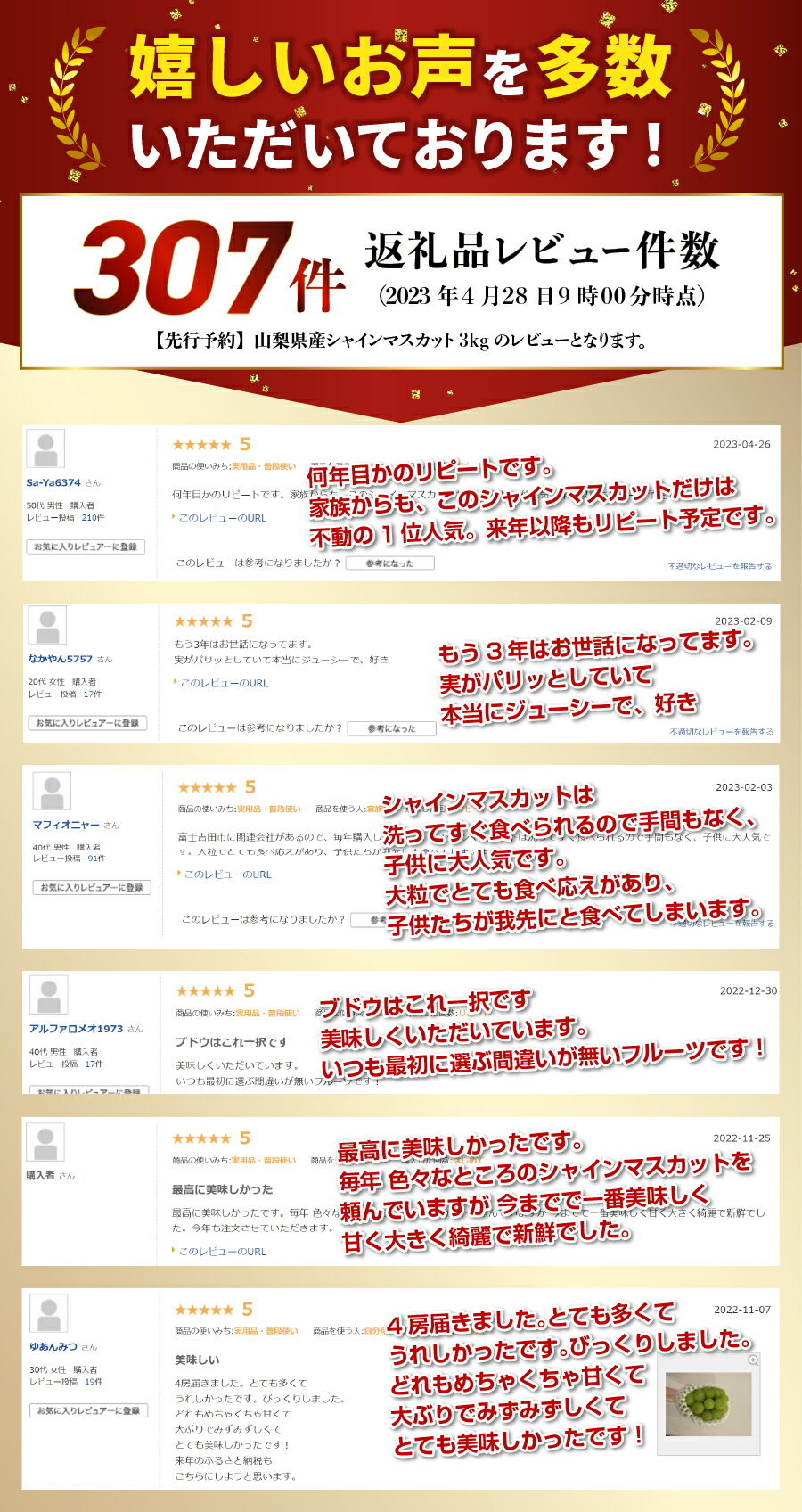 【2023年】シャインマスカット先行予約 ※2023年8月下旬から10月下旬頃のお届けとなります。 〜トップ産地から高級シャインマスカットをお届けします〜 シャインマスカットは、ぶどうの女王「マスカット・オブ・アレキサンドリア」の血を引く品種。 特有のマスカット香と上品な甘さが特徴で、種もなく皮ごと食べられることから、一躍、人気のぶどうになりました。 フルーツ王国山梨の恵み、ぜひご賞味くださいませ! ◆シャインマスカットについて ・シャインマスカットは日持ちがよいほうですが、生鮮品のためなるべくお早めにお召し上がりください。 ・ラップや新聞紙で包むか、ポリ袋に入れるなどして乾燥を予防し、冷暗所または冷蔵庫の野菜室で保存します。 ・食べきれない場合は冷凍も可能です。保存用袋などに入れて冷凍庫へ。 (できれば軸を少し残すようにハサミでカットし粒をばらしてください。) 注意事項・その他【必ずお読みください】 ※住所変更/長期ご不在日は余裕をもって事前におしらせください。(出荷前後での対応は出来かねておりますので、ご承知おきください。) ※日時指定は出来かねておりますのでご注意ください。 ※天候や収穫状況により出荷に多少変動がございます。 ※出荷時に伝票番号を記載した出荷メールをお送りいたしますのでご確認ください。 ※配送業者が設ける保管期限内にお受け取りいただけなかった場合、お届けが出