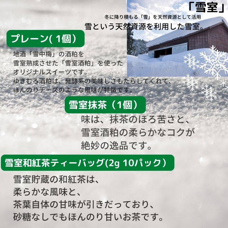 雪室貯蔵した「雪室酒粕」を隠し味に使った「雪の香パウンドケーキ」は、しっとりとした風味が特徴のケーキです。 プレーンと雪室抹茶味の2種類に雪室貯蔵で柔らかな風味になった「和紅茶」のティーバッグを詰め合わせた、オリジナルセットです。 商品概要 容量 雪の香パウンドケーキ(プレーン・雪室抹茶)各1個 雪室和紅茶ティーバッグ(2g 10パック) 消費期限 発送日込 約90日 アレルギ・・・