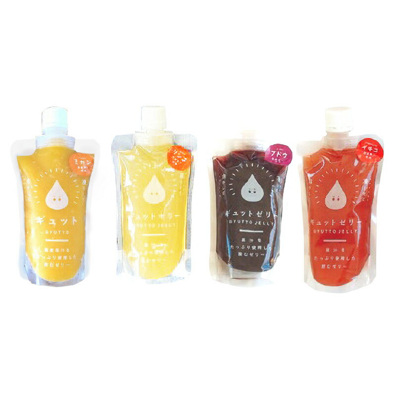 名称 飲むゼリー詰め合わせ4種7個 みかん・りんご・ぶどう・いちご 保存方法 常温 提供元 有限会社 ヤマグチ食品 賞味期限 製造日より120日以内(常温保存時) ※開封後はお早めにお召し上がりください。 ※いちごゼリーは紫外線に長時間当たると赤色が退色することがありますので、冷暗所で保存して下さい。 原材料 【1】飲むみかんゼリー 180ml みかんジュース、グラニュー糖、ゲル化剤(増粘多糖類)、乳化剤 【2】飲むりんごゼリー 180ml りんごジュース、グラニュー糖、ゲル化剤(増粘多糖類)、乳化剤、酸化防止剤(ビタミンC) 【3】飲むぶどうゼリー 180ml ぶどうジュース、グラニュー糖、ゲル化剤(増粘多糖類)、乳化剤 【4】飲むいちごゼリー 180ml いちご果汁、グラニュー糖、ゲル化剤(増粘多糖類)、乳化剤 アレルギー表示(28品目) 本返礼品には以下のアレルギー物質が含まれています。 りんご 特記事項 本品製造工場ではもも、りんごを含む製品を生産しています。 配達外のエリア 離島 お礼品の特徴 まるで果物を食べているかのような、常温タイプのゼリーです。 各種イベントでは、特に小さなお子様に大人気! オリジナルキャラクターデザイン「ギュットゼリー」も、 持ちやすいスパウト付パウチ容器も、お子様向けの食べやすい仕様となっております。 国産ストレート果汁に、グラニュー糖、ゲル化