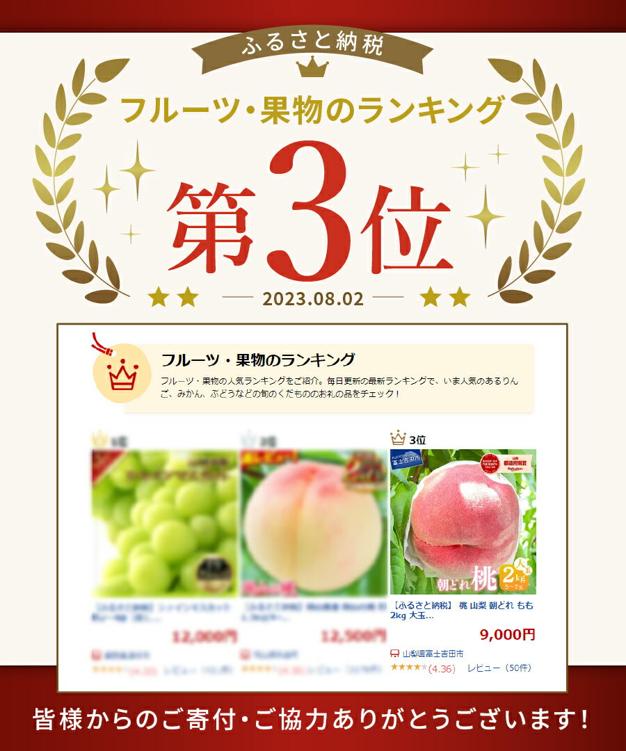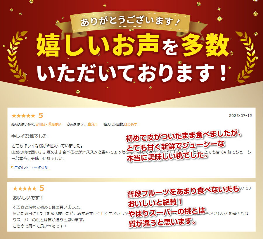 ※2023年6月下旬から8月下旬頃のお届けとなります。 ※沖縄および離島へのお届けはできません。 ーーーーーーーーーーーーーーーーーーーーーーーーーーーー 〜受賞歴・ランキング〜 2021年Let月間出品社 準ヒット賞受賞 2022年Let月間出品社 ヒット賞受賞 2022年8月楽天ショップ・オブ・ザ・マンス受賞・2022年10月度.11月度楽天 月間優良ショップ受賞 ーーーーーーーーーーーーーーーーーーーーーーーーーーーー 〜山梨の朝どれ桃を産地直送いたします。〜 桃の名産地、山梨の青果店だからこそお届けできる採れたて新鮮の厳選された大玉桃を食べてみてはいかがでしょうか。 採れたての桃をその日に発送させていただきます。 大きく甘く、ジューシーで山梨ならではの固い桃を是非ご堪能ください。 山梨県の寒暖差のある地域で収穫し、厳選された桃だけをお送りさせて頂きます。 ■生産者の声 池田青果は厳選された果物を責任をもって消費者様へご提供させていただいております。 山梨県は、昼夜の寒暖差が大きく、年間の日照時間が長く、さらに年間の降水量が少ない環境にあります。 また、富士川水系の一般河川笛吹川に合流するいくつもの川があり、それらが山の谷間から運んだ砂礫が積もり扇状地を形成します。 扇状地は水はけがよく果物の栽培に適していることから山梨県が果樹大国と呼ばれる所以となっております。 このように
