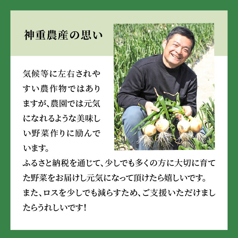 商品説明 名称 【ふるさと納税】【先行予約】初夏の新玉ねぎ「旬玉」プレミアム5kg 5月発送 ブランド玉ねぎ 玉ねぎ 新玉ねぎ 国産 愛知県産 野菜 やさい 農家直送 畑直送 旬 期間限定 H105-077 内容量 5kg(10玉前後) ※L~2Lの大玉のみをお届けいたします ※箱の重さを含みます アレルギー 特定原材料7品目および特定原材料に準ずる21品目は使用していません 発送期日 5月中に発送 ※不在日がある場合が備考欄にご記載ください。 ※天候や生育により、発送開始日が遅れる場合があります。 ※生もののため、沖縄県と一部離島に関しては寄付お受けできません。ご了承ください。 消費期限 生鮮食品のためなるべく早めにお召し上がりください。 配送方法 常温 商品説明 5月中にお届けする初夏の新玉ねぎ「旬玉」プレミアムです。 旬玉とは… えぐみが少なく、生でそのまま水にさらさず食べれる新玉ねぎです。 程よい甘みと、溢れ出すみずみずしさ、白く肉厚な実が最大の特徴です。 5月は生で食べても、加熱しても美味しい贅沢な季節! その年の気候にもよりますが、玉も大ぶりになり肉厚で実も締まり、生で食べるとシャキシャキでみずみずしくて柔らかく、火を入れれば、トロトロ甘々。 玉ねぎの辛味が苦手な方は、オニオンスライスに切って、冷蔵庫で少し寝かせてからたべるのが、おすすめです。 ※旬玉は神重農産の登録商